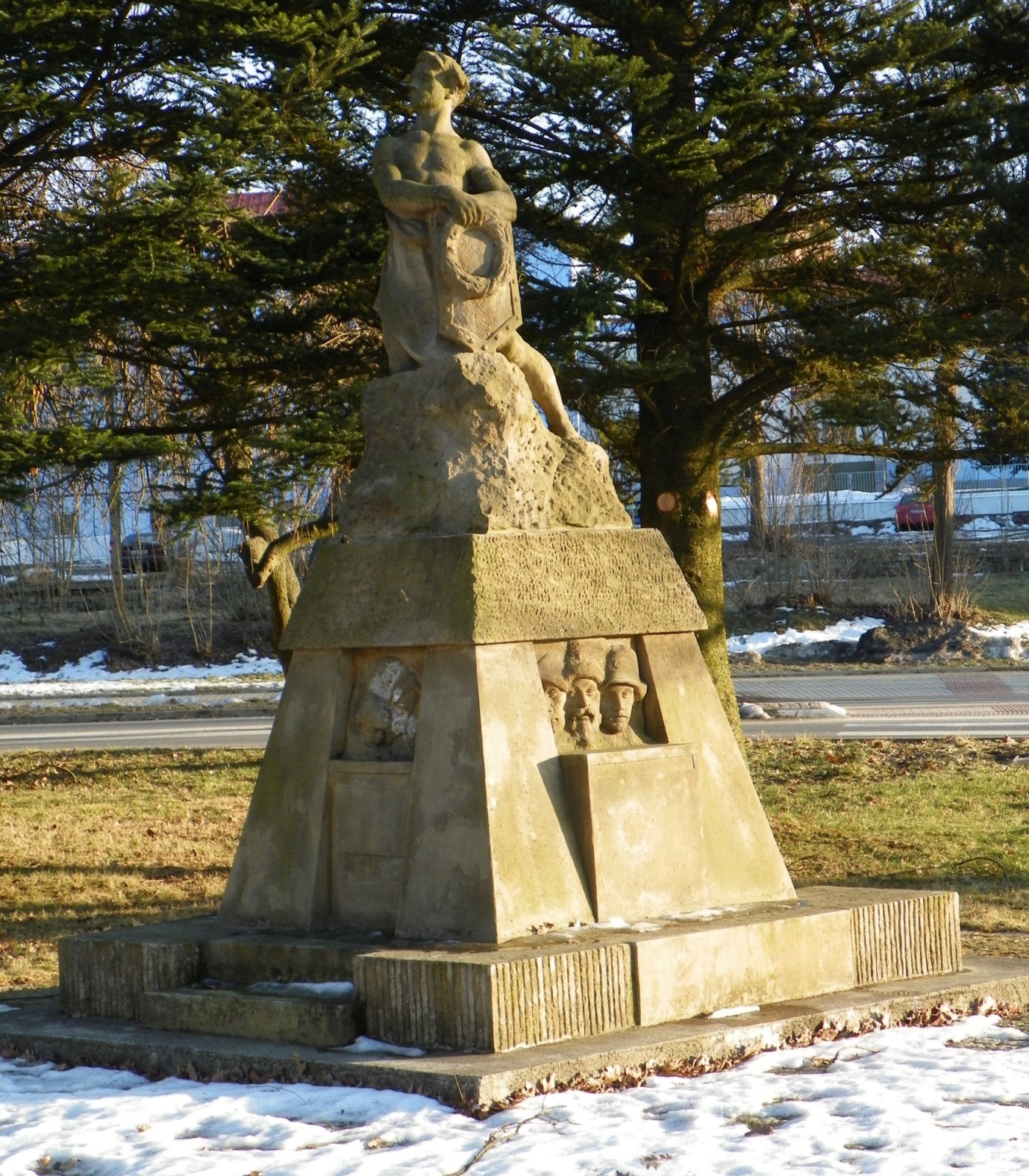 Pomník odhalený ve Žďáře 9. října roku 1921. Slovanský bojovník se štítem a věncem, na podstavci z komolého kužele. Autorem je sochař Julius pelikán. Pomník několikrát změnil své místo a za německé okupace z něj musely být odstraněny původní nápisy. „Padlým legionářům a spoluobčanům ve světové válce“ a „Po přejítí vichřice hněvu, Vláda věcí Tvých k Tobě se zase navrátí lide český“. Pomník byl pořízen Československou obcí legionářskou. Na bocích komolého kužele jsou reliéfy. Původní místo pomníku bylo na dnešním náměstí Republiky, kde u něj byl parčík se stromy.