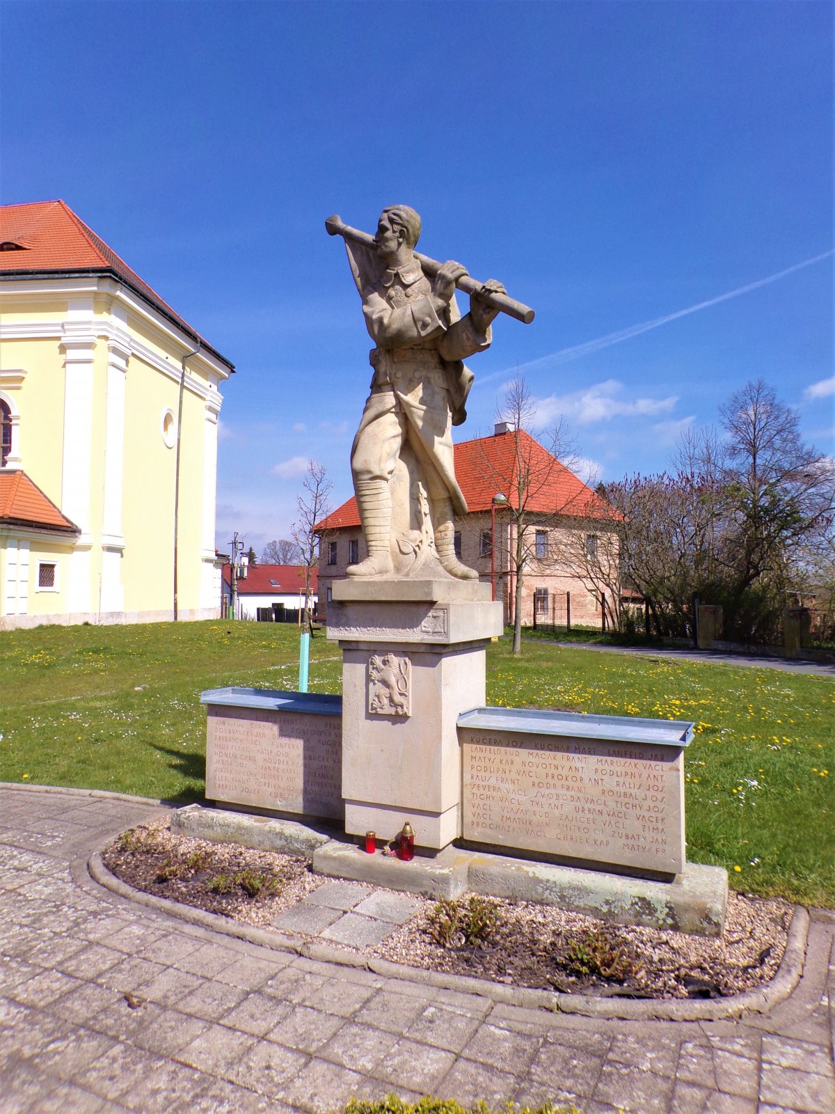 Zejména z toho důvodu, že autorem návrhu byl akademický sochař Josef Bílek z Hořic a provedl ho jeho bratr František Bílek, sochař v Podhorním Újezdu. Tato jména totiž měla po celém kraji velmi velkou reputaci a byla dokladem toho, že se pomník stane velmi umělecky zdařilou dominantou obce. Vznikl tak pískovcový pomník se sochou praporečníka v legionářské uniformě na vyvýšeném středovém kvádrovém soklu s nápisem: „PRAVDA VÍTĚZÍ“ a s malým státním znakem a s po stranách dvojicí desek se jmény místních válečných obětí: „BABÁK JOS., BLAŽEK FRANT. RUS. LEG., BRADNA JAN RUS. LEG., ČERMÁK FR., DOBROVSKÝ VÁCL., DOUBRAVSKÝ JAN, DUŠEK STAN., FLÍGR ANT., FRYDRYCH VÁCL., FUNDERA ANT., HÁK FR., HALÍŘ FRANT., HÁTLE OLD., HLUBUČEK VÁCL., HONZÁK CYRIL, HOUDEK KAREL, JANSA ANT., JAROŠ JOS., JIRÁNEK KAREL, JIRÁNEK FR., JIRSÁK VÁCLAV, JELÍNEK ANT., JELÍNEK FRANT., KLEPL FRANT., KOPŘIVA JOS., KROUŽÍLEK JIND., KŘEPELA JOSEF, KUBIŠTA KAREL ITAL. LEG., KUČERA JOS., KUCHAŘ MART., LANFELD JAR., LANFELD RUD., MACÁK FRANT., MARUŠÁK VÁCL., MATYS KAR., NOVOTNÝ ANT., PODLIPNÝ ANT., PODLIPNÝ VÁCL., PROKOP ANT., RÁLIŠ JOS., RÁLIŠ FRANT., RODR FRANT., ROUBAL JOS., SEVERA VÁCL., SVOBODA VÁCL., TICHÝ JOS., TICHÝ VÁCL., TYL ANT., URBAN VÁCL., VACEK VÁCL., VLASÁK RUD., ZAJÍČEK VÁCL., ZIMA VÁCL., ZMÁTLIK JAN, ZMÍTKO OL., ZUBATÝ JAN, PROCHÁZKA VÁCL., CHRTEK KAR., MATYS FR.“