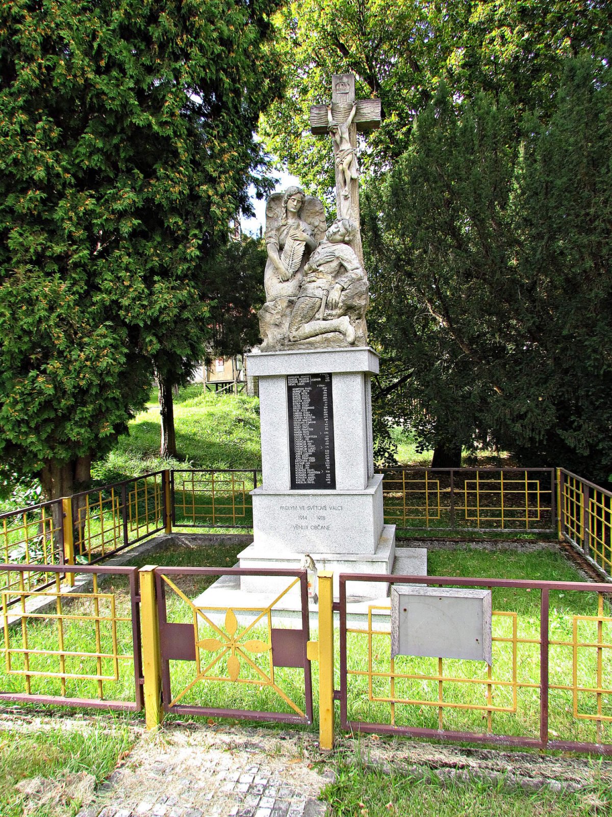 Je umístěn v centru městyse, jen pár metrů východně od mohutného chrámu sv.Jana Křtitele u hlavní silnice. Ze středu travnaté čtvercové plochy obehnané nízkým plůtkem se tyčí zajímavý kamenný pomník. Sestává ze dvou schodkovitých soklů, na nimiž stojí vysoký kvádr s černou pamětní deskou a dlouhým sloupcem jmen válečných obětí (41), doplněný úplně nahoře vlevo také jmény čtyř padlých legionářů. Pod pamětní deskou je na hořejším soklu nápis: Padlým ve světové válce 1914 – 1918 věnují občané.