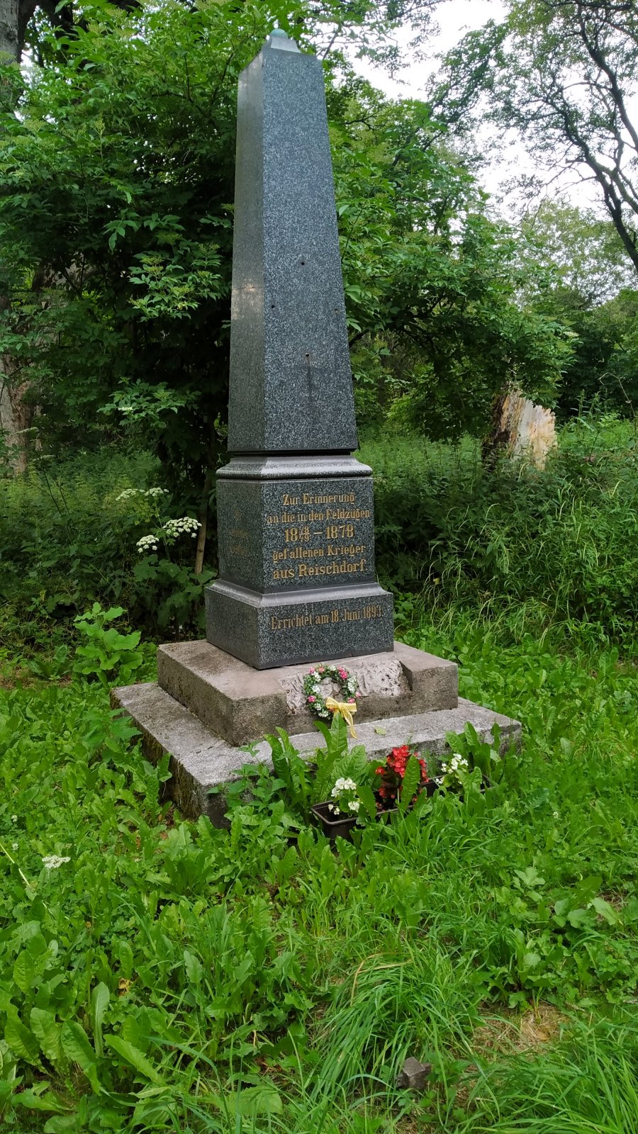 Na pomníku je nápis: Na památku vojáků z Reichsdorfu, kteří padli v taženích v letech 1848/49 – 1878.