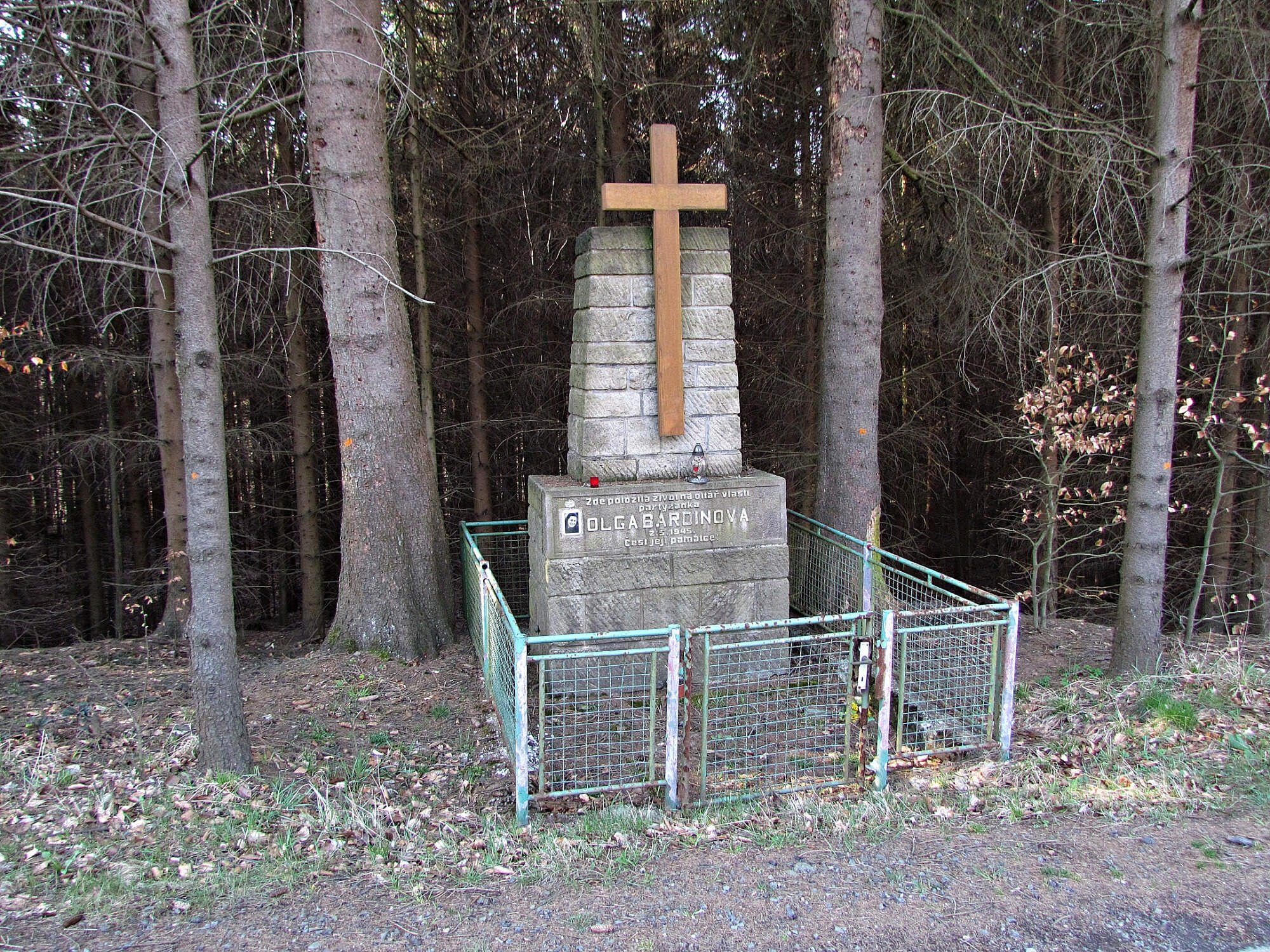 Zde položila život za oltář vlasti partyzánka OLGA BARDINOVÁ 2.5.1945. Čest její památce.