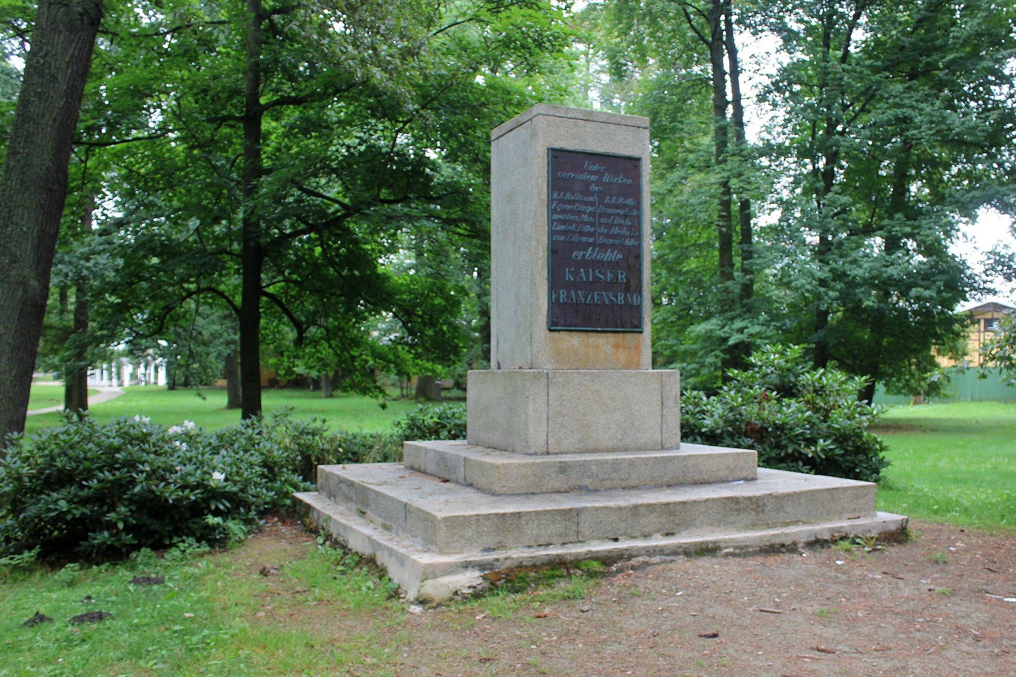 Žulový hranolový pomník zakladatelům lázní na trojstupňovém soklu s kovovou reliéfní deskou.