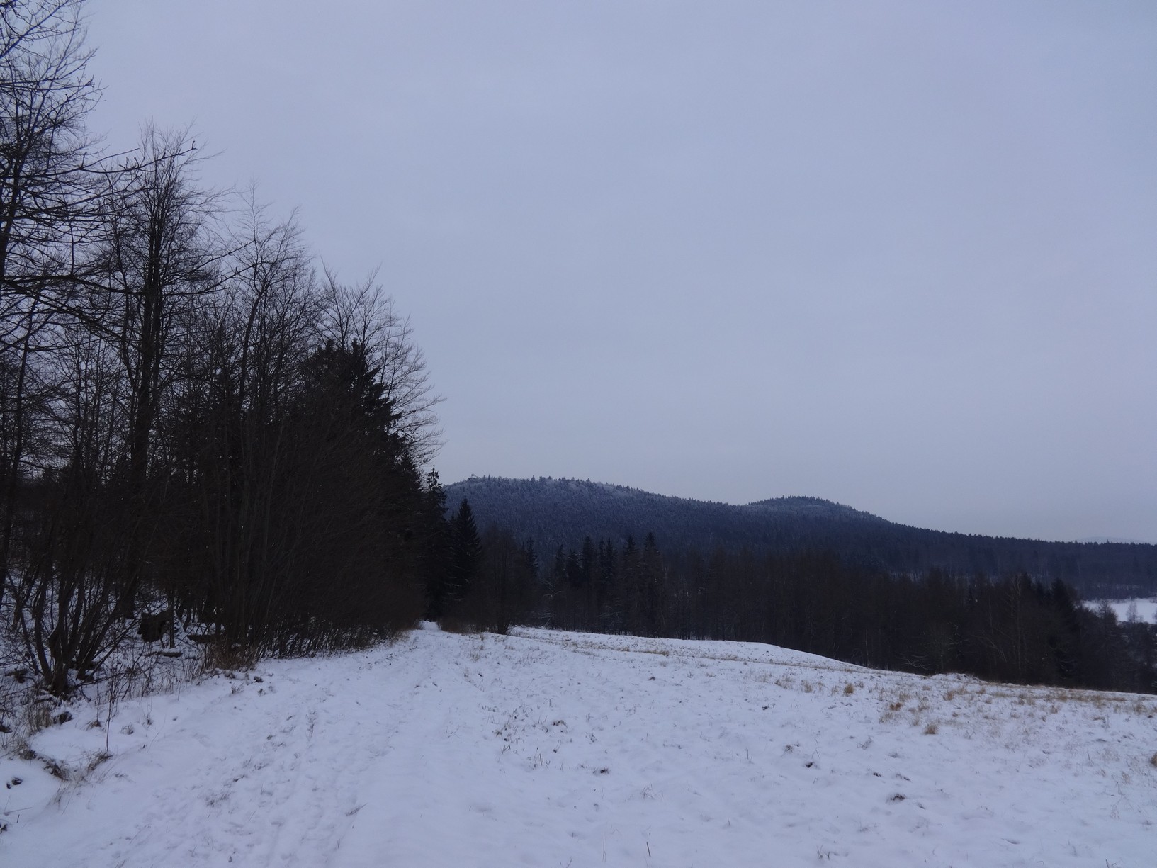 Kousek pod skalkou „Podkova“ se k zelené přidává modrá a my pokračujeme do mírného kopce po širší lesní cestě. Za chvíli přicházíme do sedla pod Popovou skálou, kde si může člověk odpočinout. My v tomto zimním počasí jsme se tady dlouho nezdrželi.