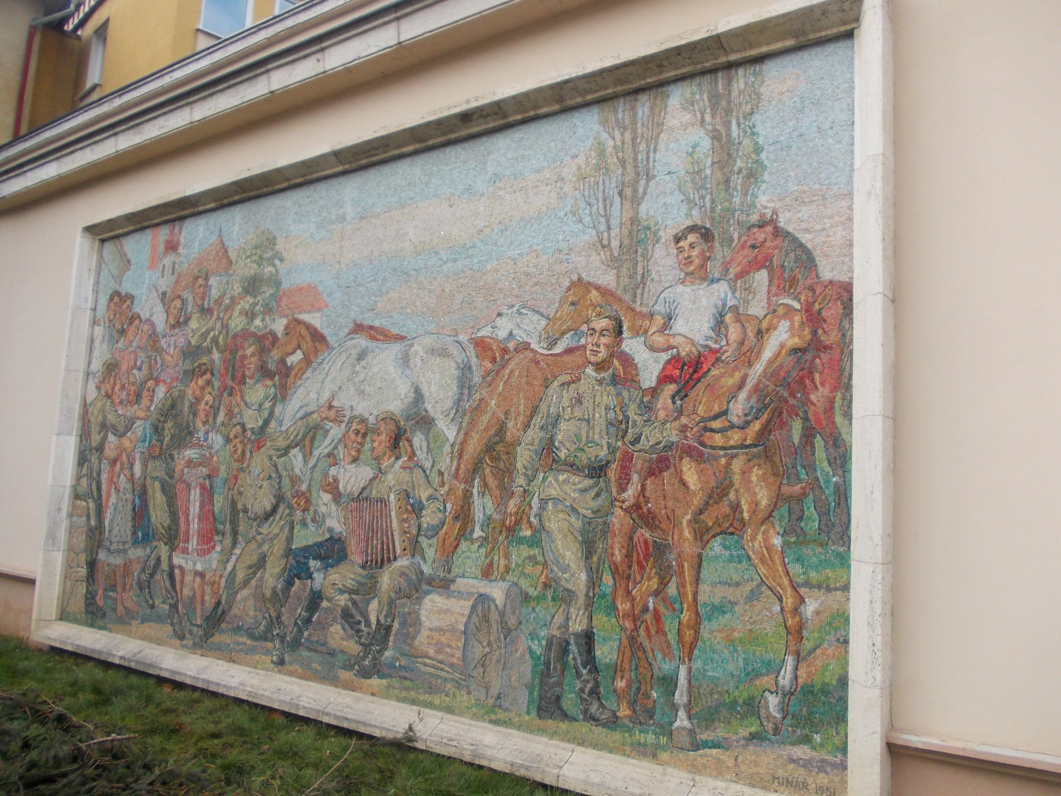Mozaiku o rozmere 6 x 4 metre odhalili v deň sviatku ukončenia druhej svetovej vojny, 9. mája 1957 pri príležitosti 12. výročia oslobodenia Československa. Jej autor, výtvarník Karel Minář v mozaike zobrazil radosť z oslobodenia a skončenie druhej svetovej vojny. Český výtvarník Karel Minář sa narodil roku 1901 v Kroměříži. Bol maliarom a grafikom. Zomrel roku 1973 v Prahe.
