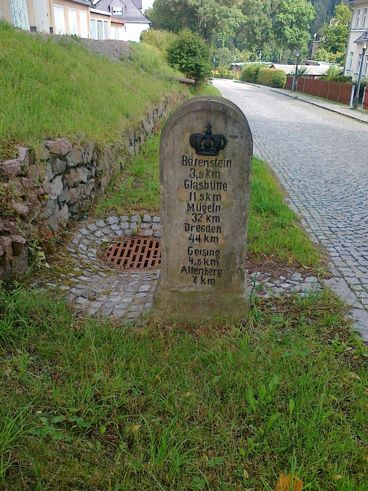 S rozvojem přepravy pošty prováděné dostavníky taženými koňmi nechal saský kurfiřt Fridrich August II. na počátku 18. století postavit ve větších městech poštovní milníky. Milníky zároveň sloužily jako zastávky poštovních dostavníků. Na milnících byly uvedeny vzdálenosti do větších měst a dojezdové časy. Milník stojí na okraji Geisingu při příjezdu z Altenbergu. Původní barokní…