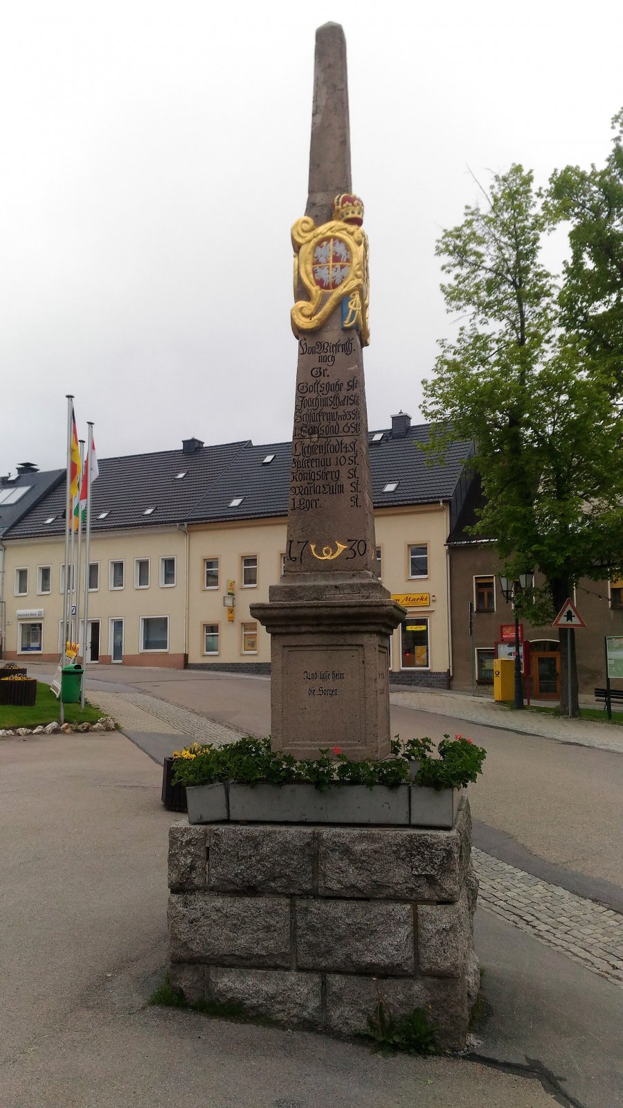 Poštovní milník z roku 1730 stojí na náměstí v Oberwiesenthalu.