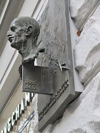 Vznik kovové pamětní desky s bustou financovala Galerie Hlavního města Prahy a je zajímavé, že se v jejím případě uvádí dva autoři rozdílných profesí. Jedním je český sochař, malíř, grafik a medailér Zdeněk Hošek, tím druhým architekt Zdeněk Edel. Jejich společné dílo vzniklo v roce 1988.