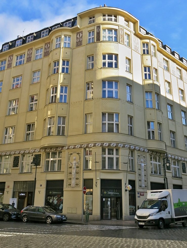 Nedaleko Staroměstského náměstí – v Kaprově ulici – najdeme velice zajímavý nárožní dům s nepřehlédnutelnou secesní výzdobou. Nejnápadnější je dvojice dekorativních vlysů po stranách vstupního portálu, která evokuje vídeňskou secesi. Mužskou i ženskou postavu zde obklopuje desítka plujících kapříků.