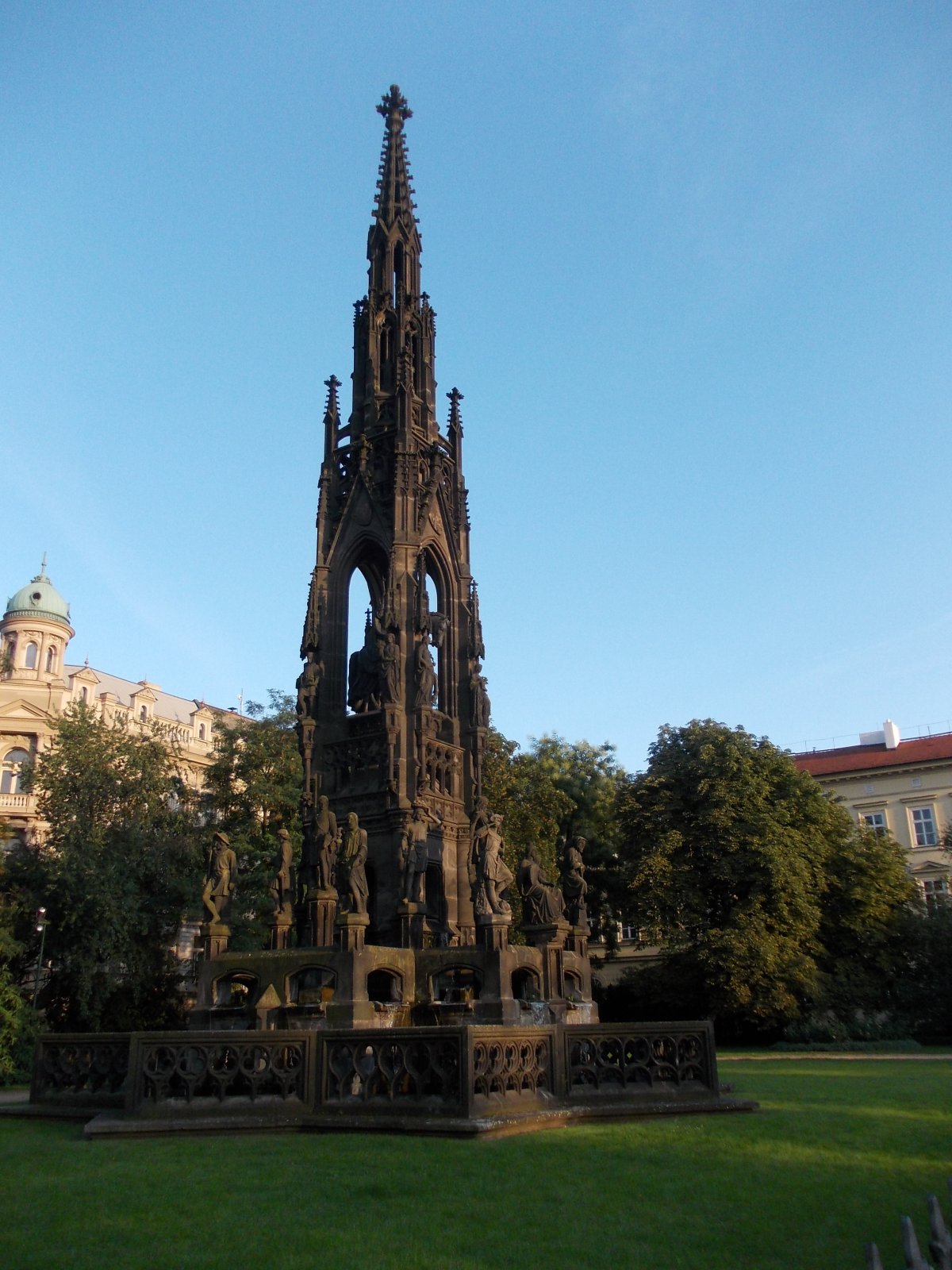 Autormi tohto diela boli český architekt Josef Ondřej Kranner a českonemecký sochár Josef Max. Ich kašna v tvare fiály, prvku z gotickej architektúry, v tvare štíhlého ihlanu s dekorativnými ozdobami krabmi, tiež nazývaných žabkami a ukončenou kruhovou kyticou, alebo podobnou výzdobou je vysoká 29 metrov. Vo svojej dobe bola najvyššou kašnou v Prahe. Pomník má pôdorys v tvare osemramennej hviezdy, pod baldachýnom je umiestnená bronzová socha cisára na koni, v jeho okolí mu robia spoločnosť sochy znázoňujúce rôzne ľudské odbory, ako napríklad priemysel, baníctvo, umenie, obchod, vedu, umenie. Nad baldachýnom, klenucím sa nad sochou, sú umiestnené štyri štíty s českým a lucemburským levom a moravskou a rakúskou orlicou.