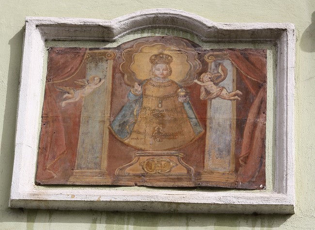 V Liliové ulici v prvním patře mezi okny domovní znamení, malba na plechu ve štukovém rámu.