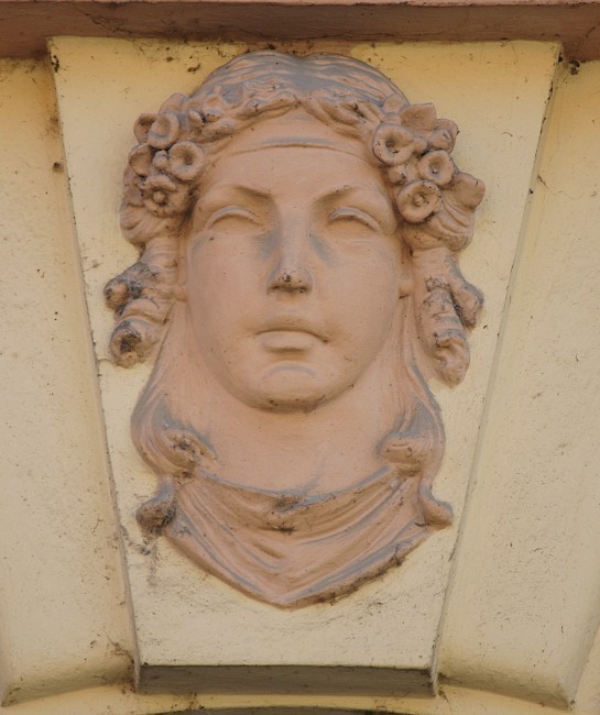 Maskaron nad vchodem je patrně ztvárněním hlavy sv. Cecílie (růže ve vlasech, atribut této světice) a můžeme jej tedy považovat za domovní znamení.