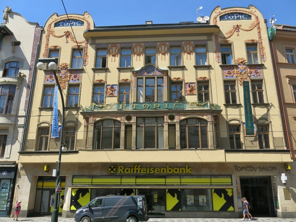 Tento krásný secesní objekt na Národní třídě je znám také jako Topičův salon, dům U Topičů nebo Topičův.palác. Jedná se o – původně empírový – dům z roku 1894, kterému dali v letech 1905 až 1908 autor projektu arch. Osvald Polívka a stavitel arch. Matěj Blecha výraznou secesní podobu. Dům tehdy vlastnil známý nakladatel a knihkupec František Topič, po kterém nese palác své jméno.