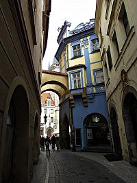 Pokud se na tomto „nejprofláknutějším“ pražském rynku otočíte k budovám radnice s věhlasným orlojem zády, upoutá vás u ústí úzké Melantrichovy ulice vlevo stojící nárožní dům. Štíhlost třípatrového stavení s klenutým podloubím podtrhuje i jeho členitá fasáda v barvách žluti a modři. Původní dům byl vystavěn již před LP 1200 v románském stylu a o 75 let později prošel gotickou přestavbou. V období renesance vznikly štíty domu, klenby podloubí a pravděpodobně i ty dva kamenné oblouky se stříškami (prampouchy) spojující jej ve výši prvního patra s protějším nárožním objektem. Dnešní podoba domu pochází z 18.století, kdy byly jeho exteriéry i interiéry s dodnes zachovalými štukovými stropy a olejomalbami upraveny ve stylu raného baroka. Původní cenná románská klenba bohužel stržena při nešťastné stavební úpravě v roce 1914.