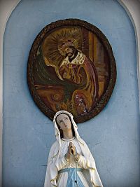 Vlastní kaple zbudovaná na půdorysu obdélníka tvoří přední část objektu a svým honosným průčelím, podpíraném po stranách sloupky a zakončeném obloukem, je obrácena k hlavní silnici. V interiéru je za sloupky umístěna soška Panny Marie a za ní na stěně v kulatém rámu obraz českého krále. Podle podoby panovníka zobrazeného pod nosem s knírkem se domnívám, že se jedná o Jiříka z Poděbrad. Sakrální prostor zdobí kombinace bělostné a modré omítky, díky čemuž působí velmi příjemným dojmem. Otevřená kaple i její sousedící uzavřená část jsou kryty společnou sedlovou střechou. Z ní vystupuje vysoká dřevěná hranolová věž zvonice zakončená jehlancovitou plechovou střechou, která je opatřena červeným nátěrem.