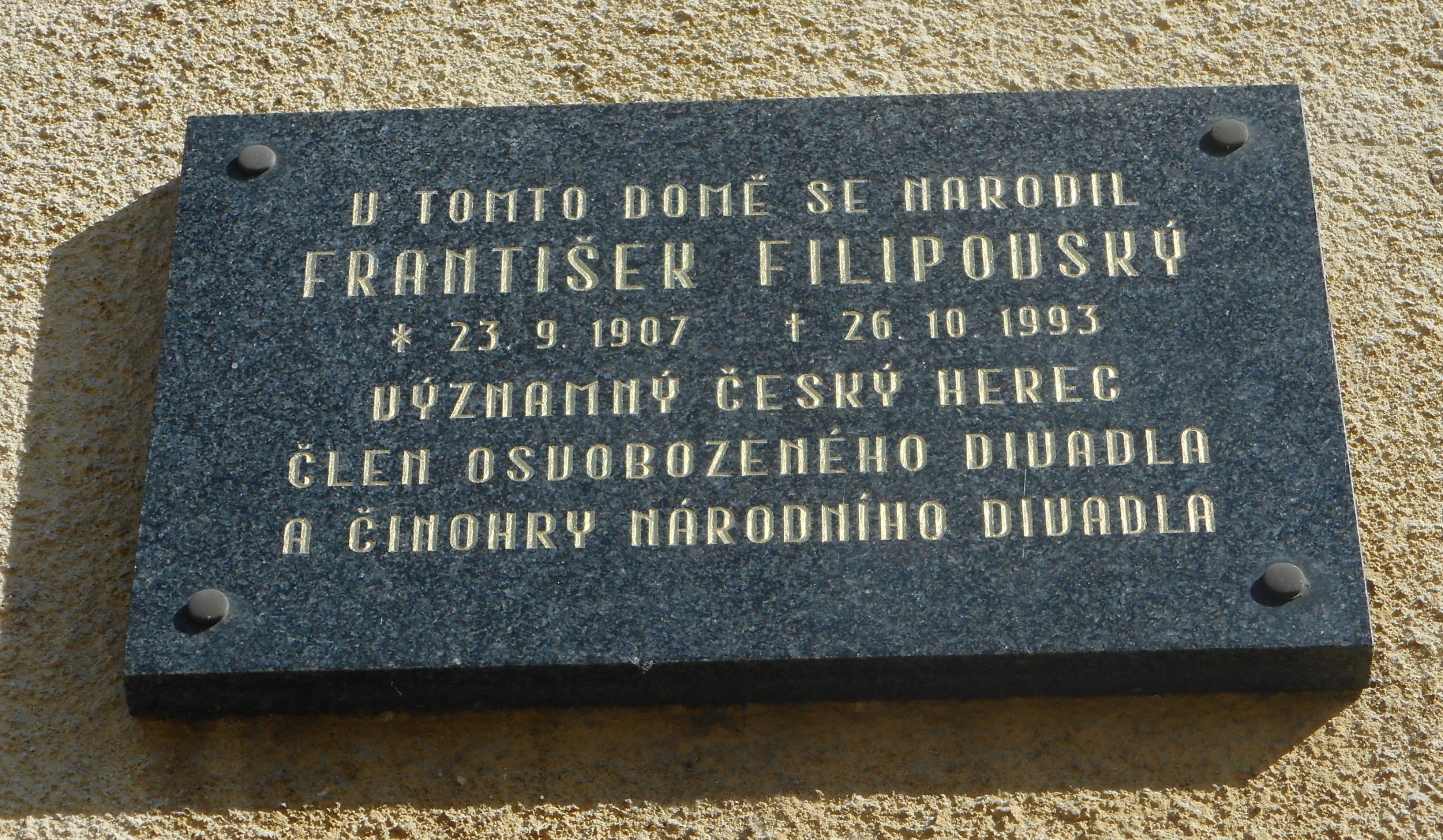 Na domě č. p. 396 v Pražské ulici se nachází pamětní deska populárního českého herce Františka Filipovského (1907-1993), který se v tomto domě narodil a strávil v něm dětství. Začínal v avantgardním Osvobozeném divadle u Voskovce a Wericha. Od roku 1945 byl členem činohry Národního divadla, kde působil až do roku 1992. Proslul jako mistr drobnokresebných postav a komických rolí.Ve filmu a v televizi ztvárnil stovky rolí. Mezi nejznámější patří snaživý student Krhounek (Cesta do hlubin študákovy duše), inspektor Mrázek (Hříšní lidé města pražského) nebo role v komediích jako Pane, vy jste vdova! Jeho nejslavnějším počinem v dabingu bylo propůjčení hlasu Louisi de Funèsovi. V Přelouči se na jeho počest od roku 1995 udělují Ceny Františka Filipovského za dabing.