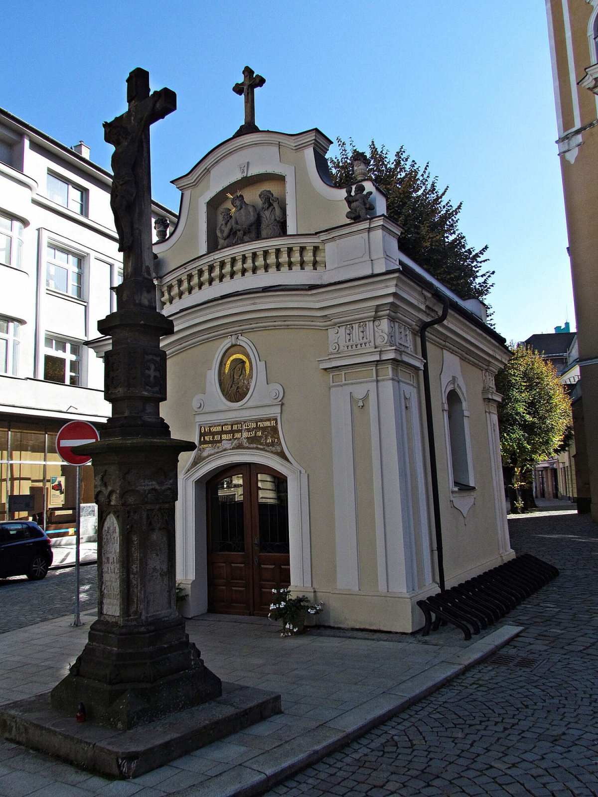 Narazíme na ni na výstavné Kratochvílově ulici, stojí v těsné blízkosti kostela sv.Vavřince. Když býval okolo tohoto farního chrámu ještě hřbitov, sloužila jako márnice. Po zrušení žalova byla v půli osmnáctého století přestavěna na líbivou barokní kapli a její interiér ozdobila skulptura Piety. Objekt má honosné průčelí: nad nízkým vchodem je umístěn oválný reliéf Panny Marie, nad ním balustráda přikrášlená na obou koncích po sošce andělíčka a nad ní se nachází sousoší (spíše poloreliéf) Krista se dvěma postavami. Zdali se jedná o jeho dva spolutrpící na křížích anebo snad o Ježíšovy katy, tak to nevím…