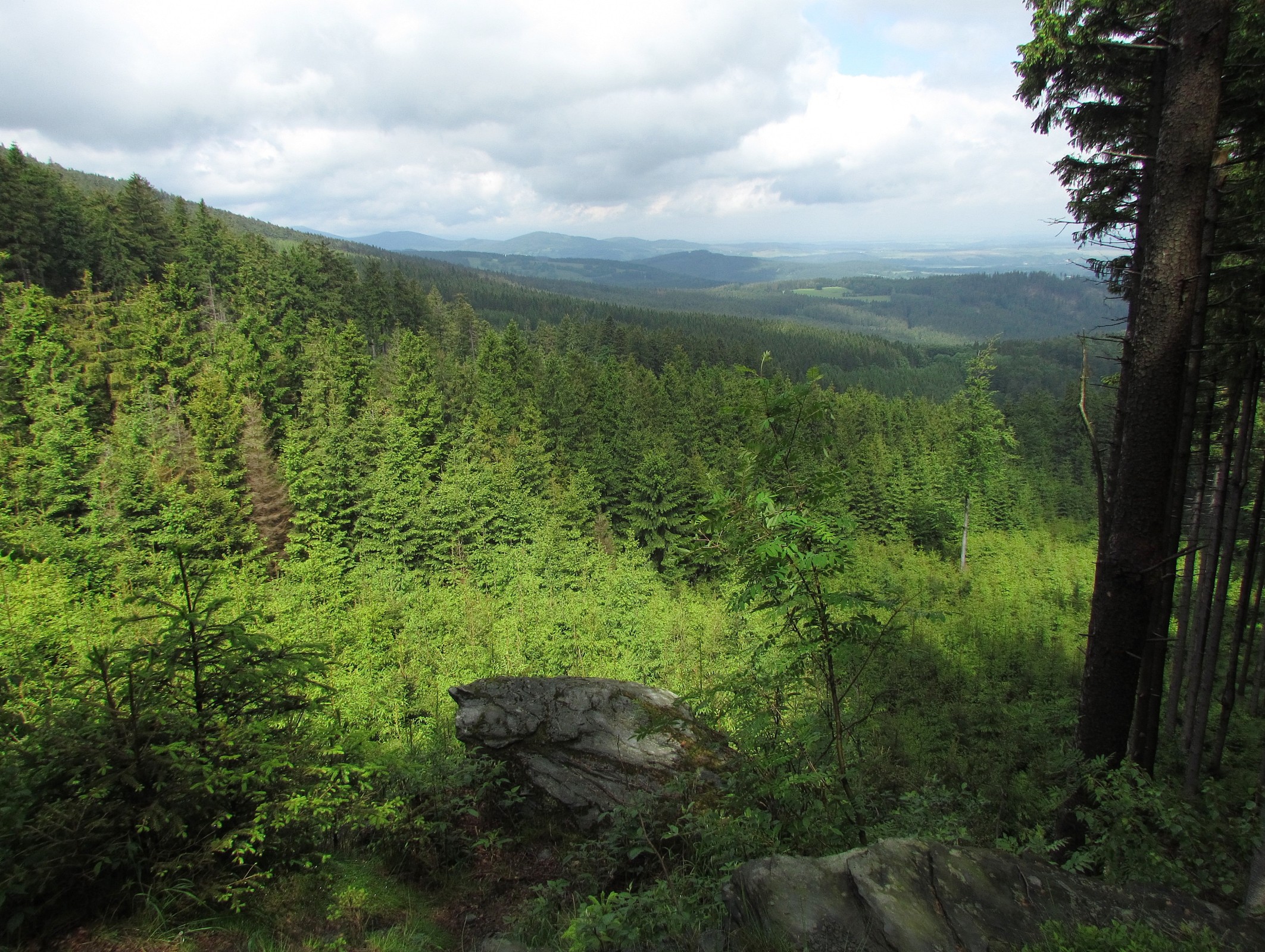 Po následujícím prudším stoupání jsem dosáhl vlastního vrcholového hřebene Příčného vrchu, ale ten je v těchto místech zarostlý lesem. Což mi ani moc nevadilo, protože mne čekala ta největší zdejší lahůdka – Starohoří – a teprve když jsem se plný dojmů vrátil zpátky na hřeben, za Olověnou štolou jsem narazil na další krásný panoramatický výhled. Bohužel ne kruhový, ale s výsečí jen na město Zlaté Hory, jeho hornaté okolí a na veliký kus polské nížiny. I tak to ale byl díky mrakům (proměnlivé počasí) výhled přímo božský.