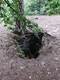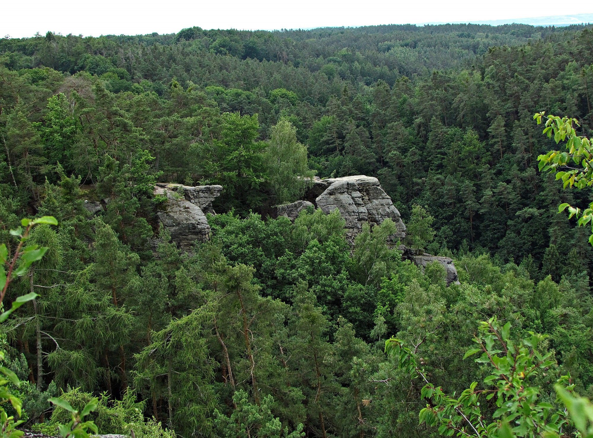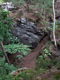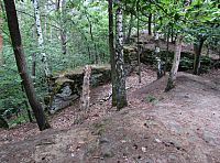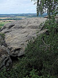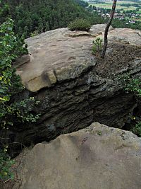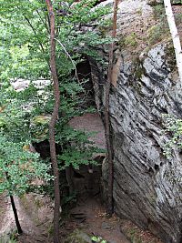 Tuhle zadní část hradu jsem si bohužel prohlédnout nemohl. Moje návštěva Klamorny proběhla pod zataženou oblohou, směrem ke světničkám jsem nikde neviděl nějaký rozumný přístupný chodník (zeptat se nebylo koho, byl jsem tu sám) a na to, abych k nim zkusil ve skalách krkolomně sestoupit, jsem neměl úplně tu nejvhodnější obuv. Protože mne ještě čekala cesta na mnohem zachovalejší Valečov, odložen jejich průzkum někdy „na příště.“ Chtěje se utěšit alespoň pěkným pohledem do okolí, vykročil jsem k poslednímu skalisku, jehož ploché témě od hlavního masívu oddělovala jen asi metr široká, ale nesmírně hluboká puklina.