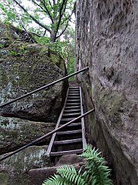 Nejúžasnějším výhledovým místem v celé skalní oblasti je bezesporu vrcholová plošina skalního hradu Drábské světničky, jenže ty jsou kvůli havarijnímu stavu pro veřejnost už nějakou dobu uzavřeny. Znovu přístupny budou po nezbytných opravách až zhruba v polovině roku 2026 a to kdoví jestli, protože za mé červnové návštěvy letošního roku se tu vůbec nic nedělo. Dokonce ještě nebyl opraven ani poničený povalový chodník, jímž se do areálu skalního hradu vchází. Turisté, kteří sem přišli směrem od Krásné vyhlídky po modré anebo červené tur.trase tudy sice mohou projít bez omezení, ale z vlastního hradu zdola moc neuvidí. Modře značená tur.trasa se tady odpojuje a klesá do obce Dneboh, červená pokračuje po okraji skal jižním směrem. Záhy vyběhne na travnatou plošinu, na níž kdysi stávalo hradiště Hrada. Bývalo výšinným sídlištěm obývaným už od pravěku. První osadníci zde žili již v 6.století před Kristem. Vystřídali je rolníci mladší doby kamenné, kamenné a bronzové. Areál poprvé opevněn až za lidu lužické kultury a obýván do poloviny 10.století našeho letopočtu. Z hradiště se zachoval čtvrt kilometru dlouhý val. Blízké skalní hrady Drábské světničky a Klamorna začaly být budovány až ve středověku.