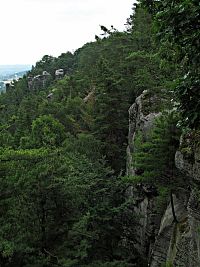 Jen kousek za minisoutěskou Ženských vrat prochází turistické značení dalším převelice atraktivním úsekem. Zatímco modrá trasa asi 80m za „vraty“ pokračuje až k Drábským světničkám pod klenbou lesa přímým směrem, červená se od ní oddělí a zamíří vpravo. Následně pak v délce více jak 300 metrů kopíruje okraj skalnatého srázu. Pod námi se z hlubiny k nebesům vypínají mohutné pískovcové bloky a věže, odsedlé již v dávné minulosti od mateřské plošiny Mužského. V současnosti jsou tyto desítky metrů vysoké skalní útvary intenzivně využívány horolezci, kteří je téměř všechny i pojmenovali.