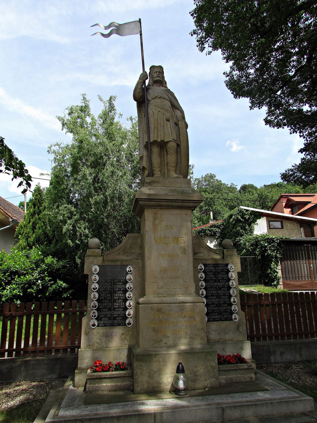 Socha sv.Václava zrobená v životní velikosti svírá v pravé ruce kovový praporec a levičkou chrání erb s českým lvem. Je umístěna na vysokém odstupňovaném hranolovém soklu, který je v horní části doplněn vyrytým nápisem: Sv.Václave, oroduj za nás!“ a ve spodní části části podstavce nápisem: Spěte sladce, s P.Bohem, padlí hrdinové ve světové válce v pokoji!