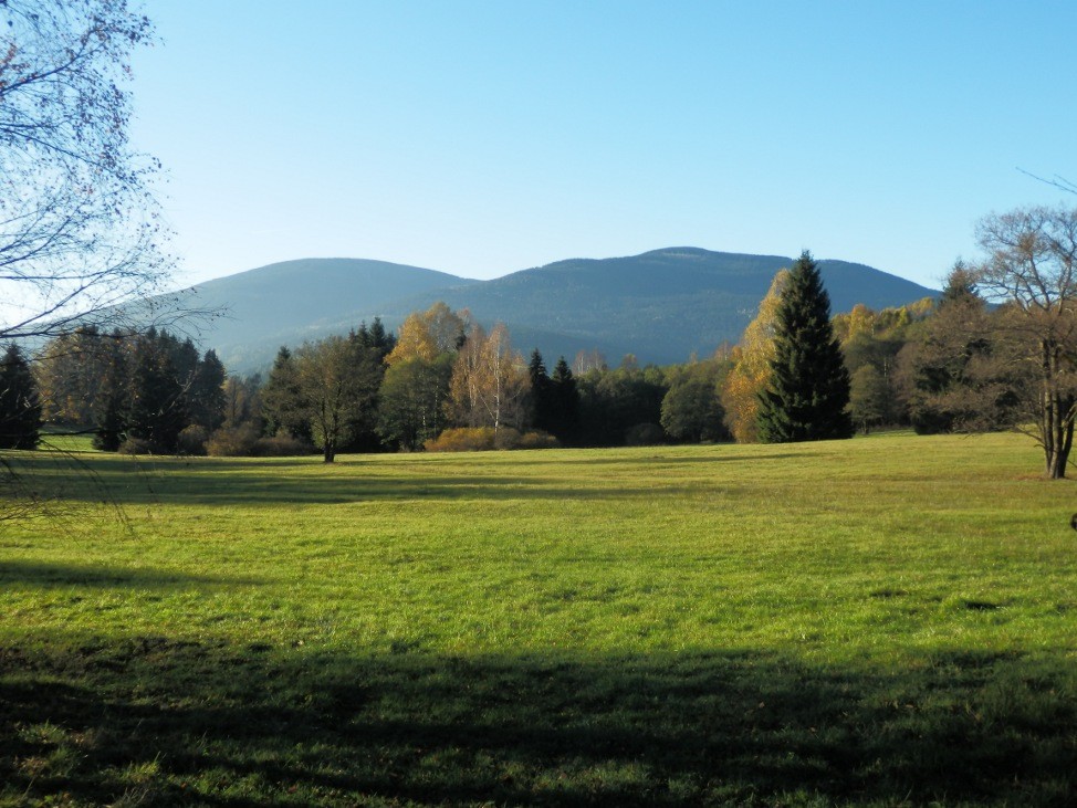 Pohled ze Slunečné stráně na Černou horu, Světlou horu a Sněžku