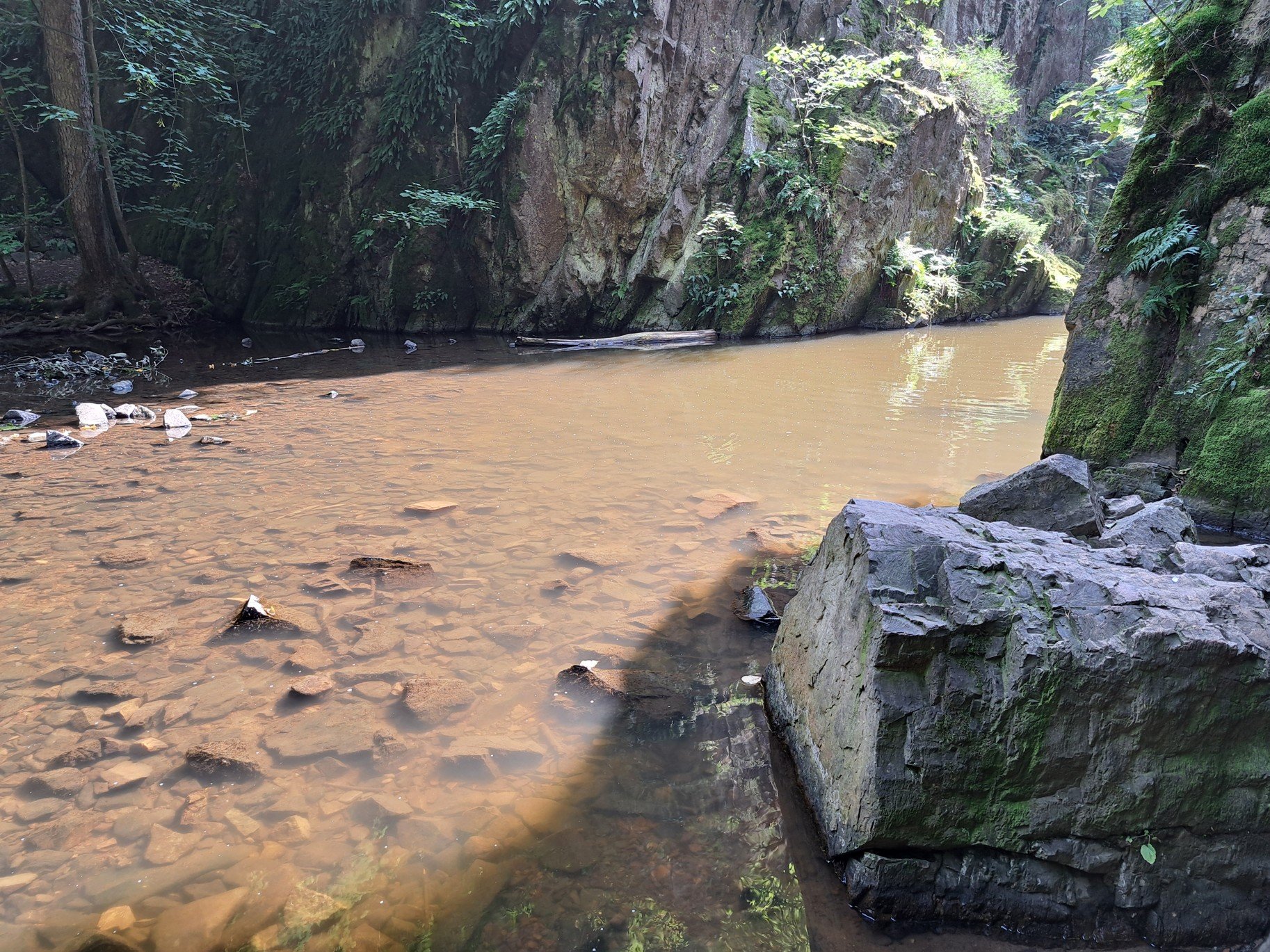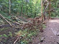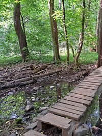 Cesta vede místy po kamenech, přes skalní stupně nebo překračuje potok po dřevěných mostcích. Někde to zajímavě podkluzuje.