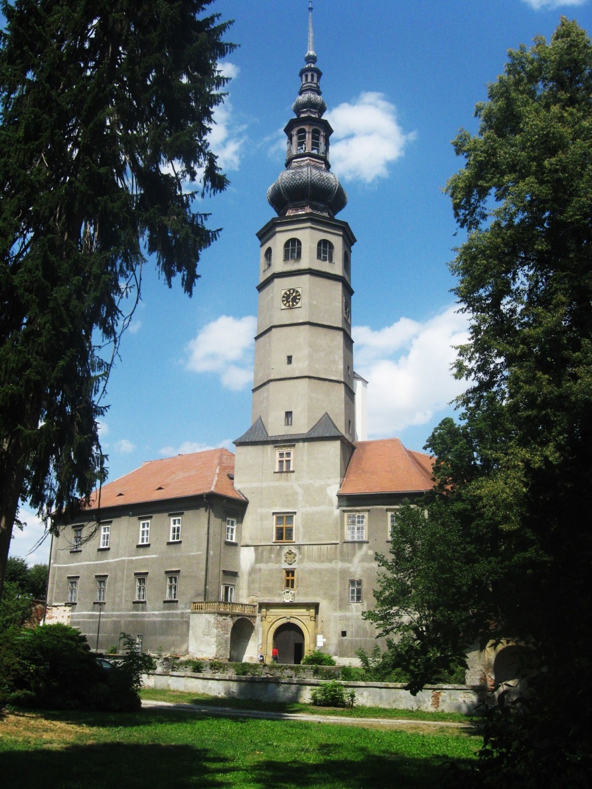 Na prohlídku jdeme s mladičkou průvodkyní jen my dva... Napřed procházíme starým palácem: je tu krásný rytířský sál s freskami a u něj ještě několik komnat, pak procházíme barokní kaplí, což je v podtatě 18 m vysoká rotunda a ta v nás zanechává nezapomenutelný dojem. V dalších sálech bez původního vybavení následuje výstava zvonů z Brodku u Přerova - na jeden je mi dovoleno si zazvonit a málem všichni ohluchneme !! Výstava dřevořezbářských prací místního učiliště je též moc pěkná a v posledním sále se kocháme vystavěnými olejomalbami s fantastickými motivy - tak tady bychom si i se slečnou průvodkyní určitě něco vybrali! Pak se vracíme na nádvoří a vstupujeme do 2. křídla, kde "jenom" prohlídka nádherného dvoukřídlého schodiště. Je to věrná replika a zmenšenina originálu ve Vídni a tímto naše prohlídka zámku končí.