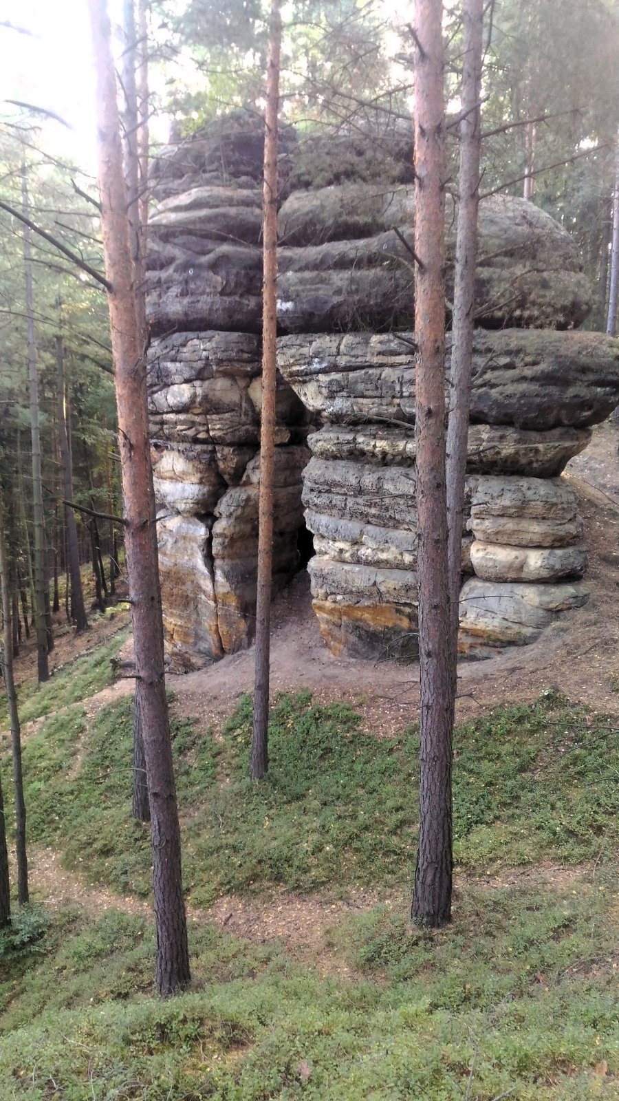 Osaměle trčící skalní útvar v lese nad hřbitovem v Dolním Prysku.