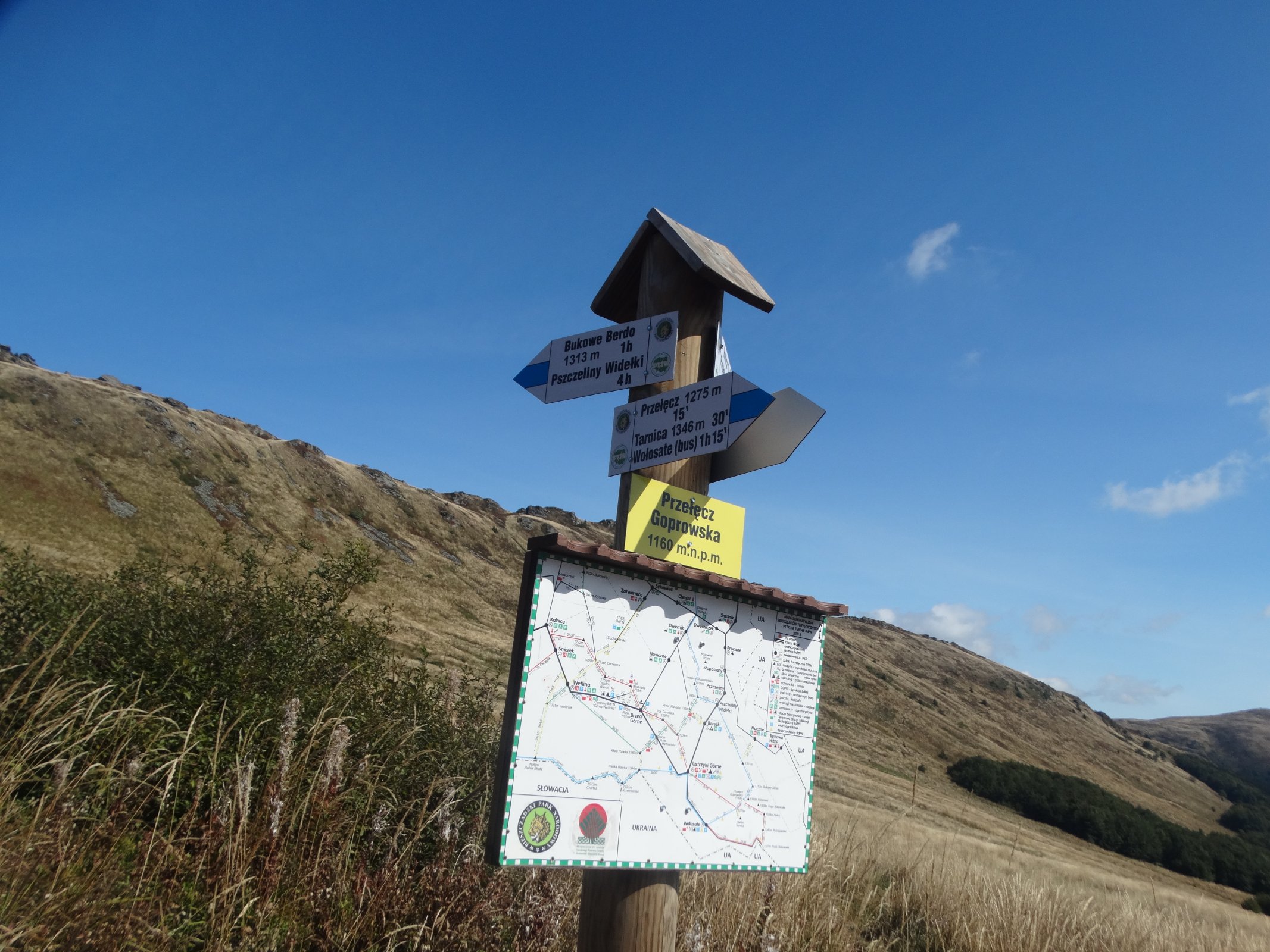 Przełęcz Goprowska - rozcestník v sedle (v pozadí vrchol Krzemień - září 2019) autor: 11965