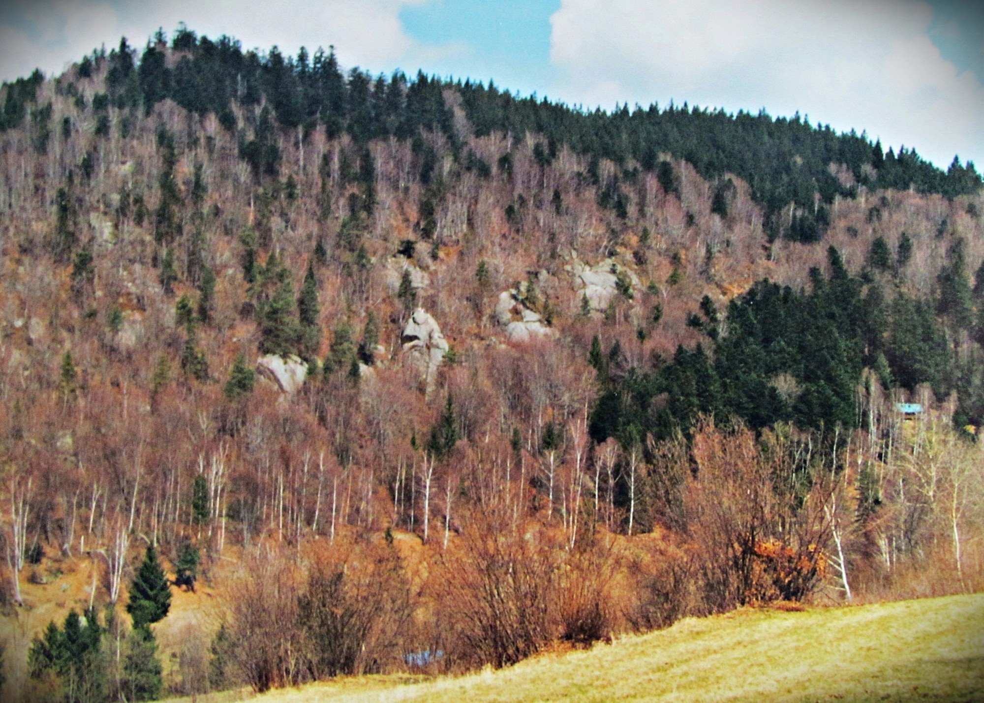 (Jenom abych ukojil vaši případnou zvědavost: kdysi dávno jsem v předjaří na té druhé a nejvyšší skalní věži byl - (ta jediná vystrkuje po celý rok svůj zašpičatělý skalní hrot nad koruny stromů) - a z vrcholu se mi otevřel zajímavý pohled na šachovnice políček u obce. Tento pohled ale zmizí s příchodem prvního listí. A protože od této mé "návštěvy" už uplynulo bezmála 20 let a okolní stromy za tu dobu o něco povyrostly, stal se tento výhled jistě už dávnou minulostí...)