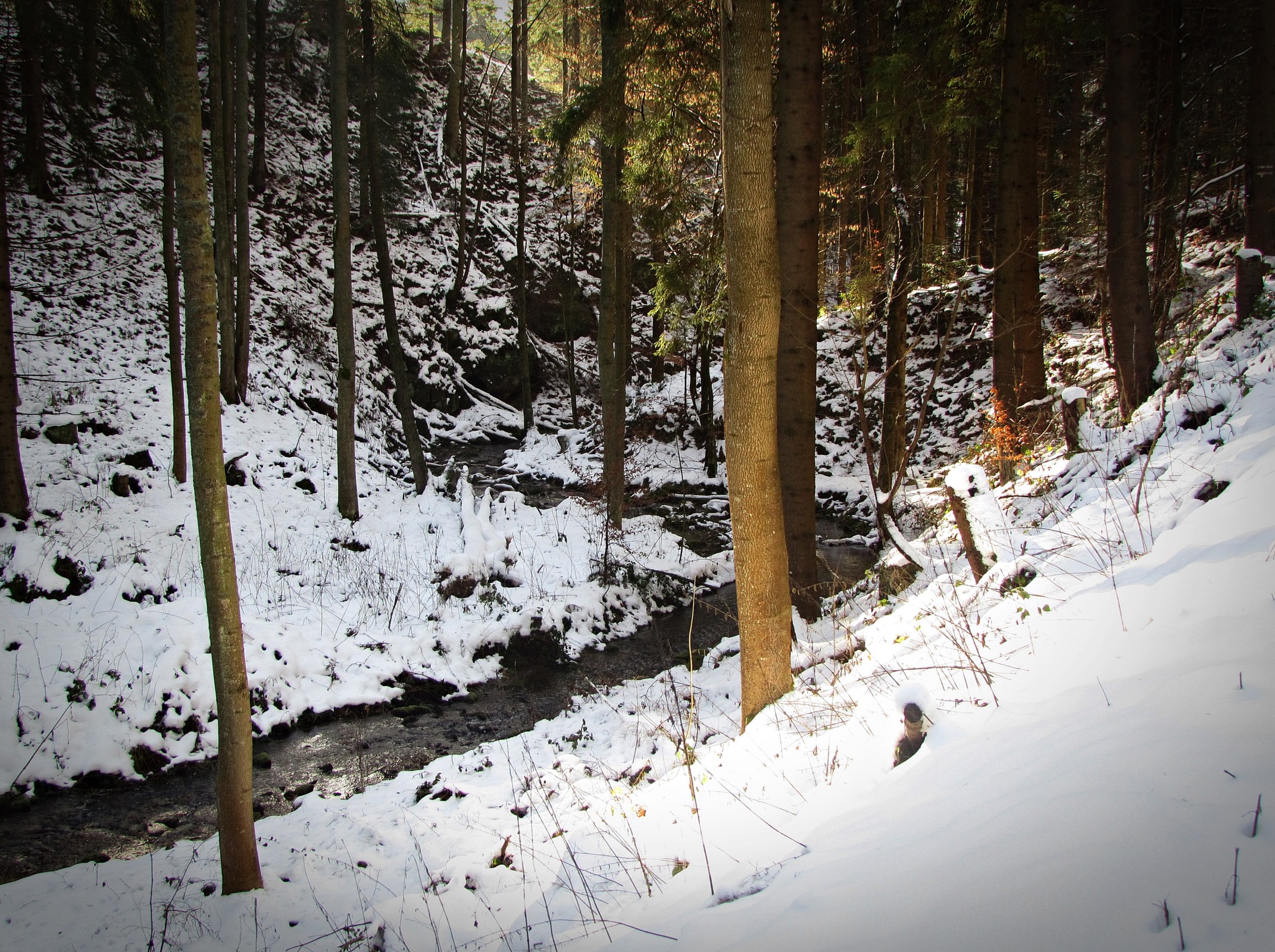Jen několik desítek metrů nad pustnoucí Plevákovou Studánkou se na potoku Pulčiňáku nachází menší přírodní zajímavost, kterou ale většina putujících míjí bez povšimnutí, neboť silnička tu stoupá v pravotočivé zatáčce a částečně se odklání od jeho toku. Stačí ale v nejvyšším místě stoupání odbočit na nízký hřebínek do lesa vpravo a nabídne se vám pohled do hluboko zaříznutého koryta Pulčiňáku, které zde vytváří jakýsi kaňonek či krátkou soutěsku. Potok má v těchto místech prudší spád a zvláště za "období dešťů" se zde vytváří soustava nepřehlédnutelných a hlavně nepřeslechnutelných vodních peřejí. Toto přírodní dílko je samozřejmě miniaturní, ale za vidění při větším stavu vody určitě stojí...
