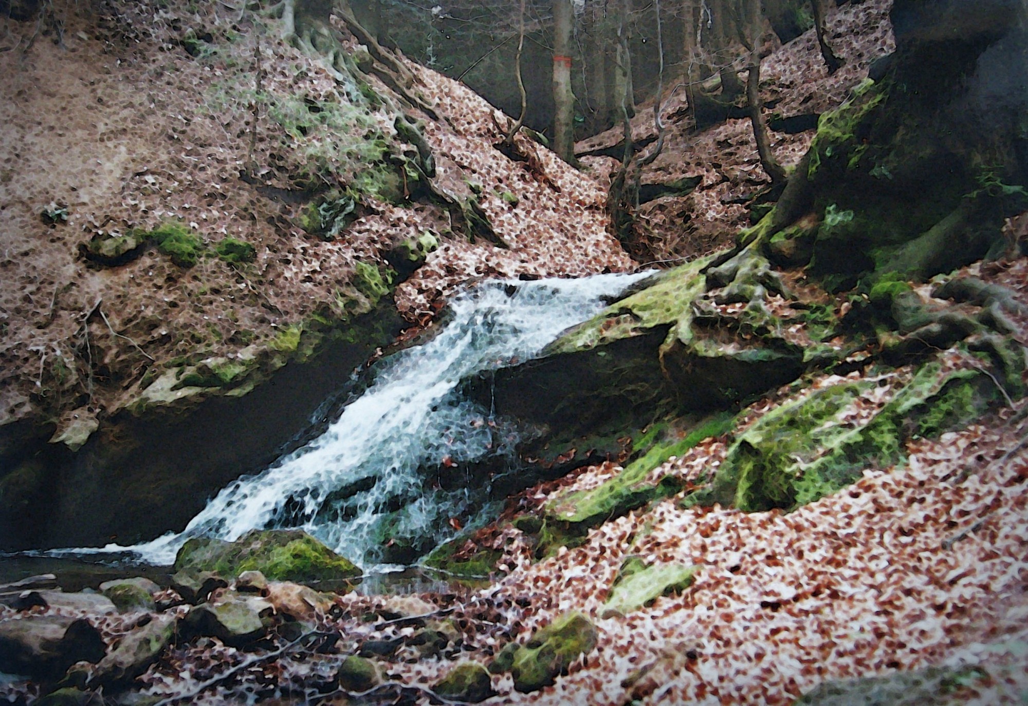 V další části údolí se potok opět zklidní a my brzy odbočíme z hlavního údolí po lesní cestě už vysoko nad potokem, odkud se k nám občas donese už jen tichý šum, kde potůček vytváří další peřejky. Nedaleko rozcestí u hlavních Pulčínských skal tak zcela bez povšimnutí mineme jedno velmi pozoruhodné místo - (přes zarostlou hlubinu údolíčka totiž z cesty není vidět), na které bych vás rád upozornil. Abychom si tuto přírodní zvláštnost mohli zblízka prohlédnout, musíme seběhnout po značce dolů k potoku, pod hlavními stěnami skal a Trtolem vystoupat pěšinkou šikmo doleva pod začátek levé dlouhé skalní stěny, a teprve odtud se můžeme stylem cik cak opatrně přiblížit po svahu dolů k potoku. Nacházíme se přibližně 50 m od hlavních skal a proti jeho proudu brzy nalezneme kouzelné místo a něco, co by v této oblasti možná nikdo nečekal: asi 1.5 - 2 m vysoký skalní práh zde potok překonává malým, ale nádherným vodopádem! Ona je to spíše ukloněná vodní kaskáda, ale přesto se jedná o místo, které by rozhodně nemělo ujít naší pozornosti, i když k němu žádná turistická odbočka nevede!