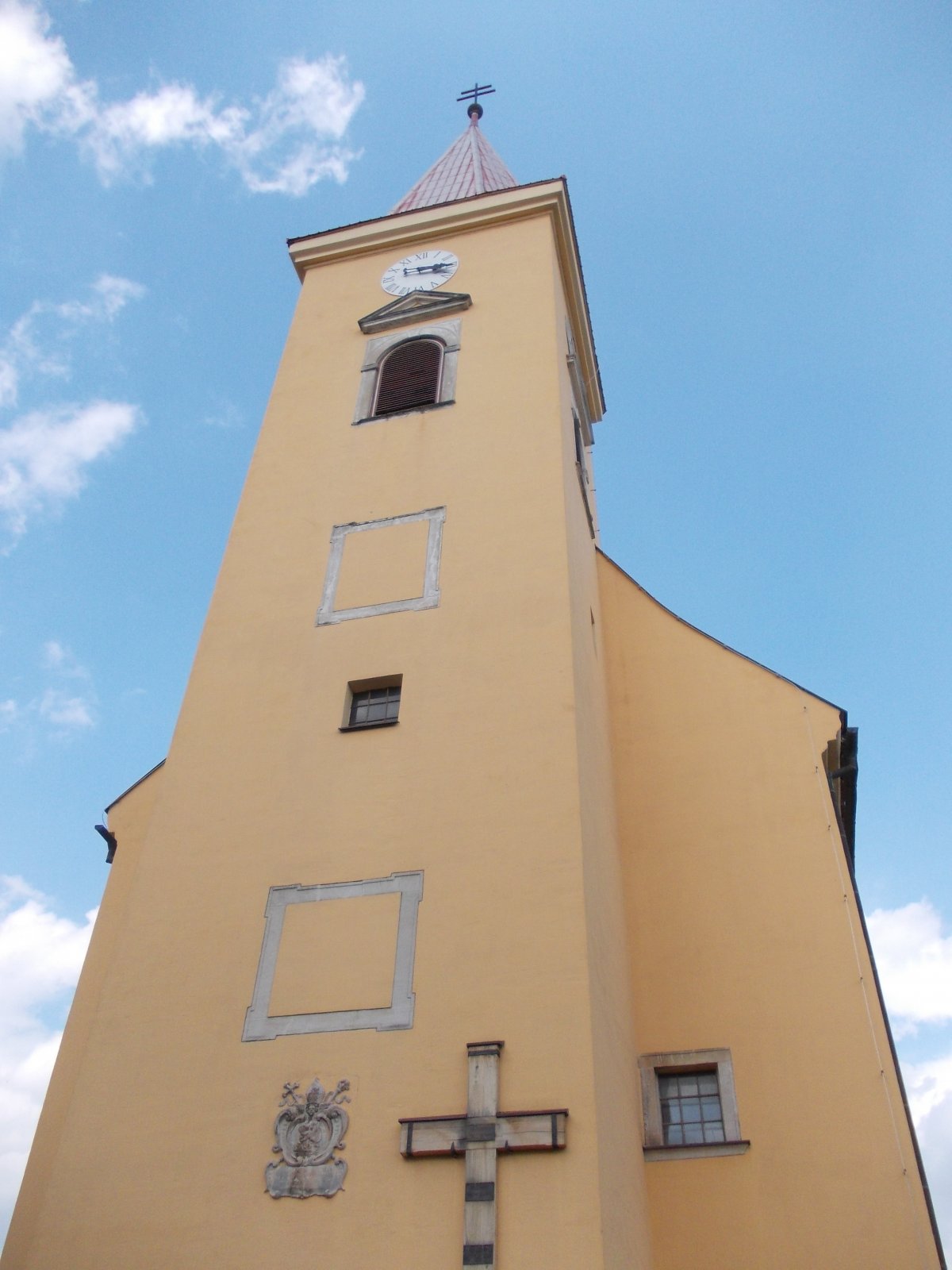zvukové okna, hodiny a ihlanovitá veža s krížom