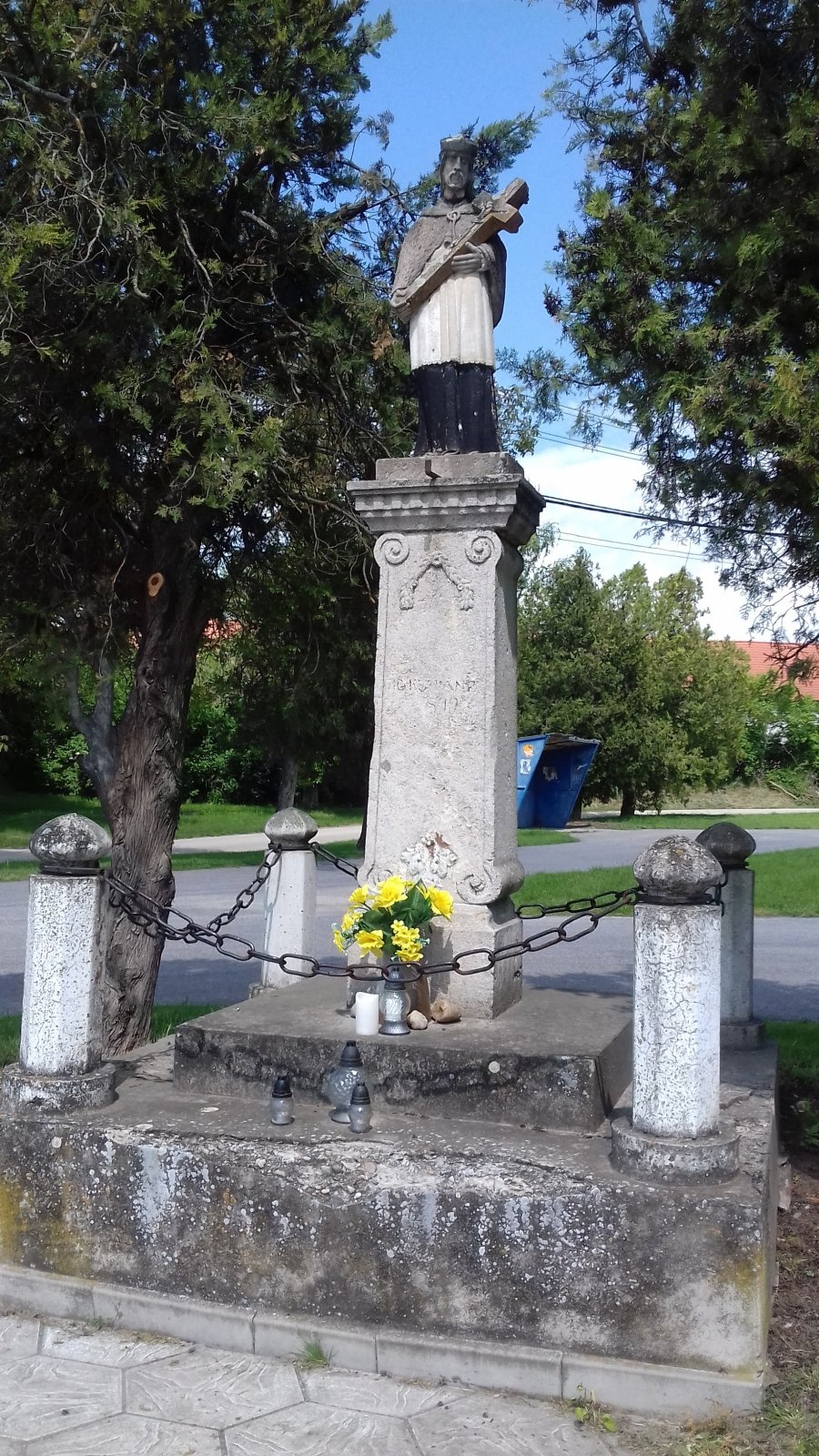 Aj ,,malá dedinka" môže mať dosť zaujímavosti, pamiatok, niekoľko ich je umiestnených pekne pohromade u kostola Narodenia Panny Márie. Spravme si takú malú prechádzku okolo týchto pamiatok u kostola. Začnime sochou veľmi obľúbeného svätca Jána Nepomuckého, socha je umiestnená na kamennom zdobenom podstavci s letopočtom 1879. Podstavec so sochou je umiestnený na dvojschodoch v pôdoryse štvorca, je ohraničený štvoricou kamenných stĺpikov prepojených kovovou reťazou. Svätec má na sebe kňašské rúcho, v rukách si pridržiava kríž.
