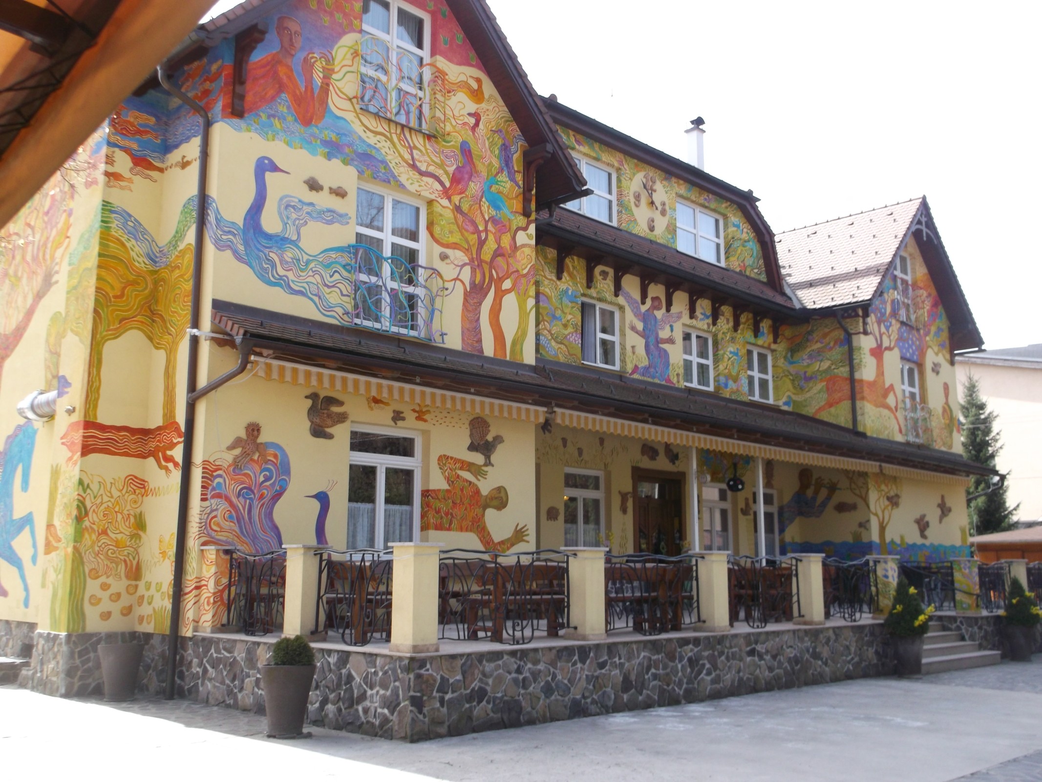 Veľmi príjemné je posedenie na jeho terase, z ktorej je výhľad na vedľajšie Labutie jazero. Tiež okolie hotela je zaujímavé. Na malom kúsku zeme môžete vidieť rozprávkové bytosti - Snehurku a 7 trpazlíkov. Vlastne sme ich narátali len šesť a siedma bola sova sediaca na kmeni stromu. Všetky postavy sú vyrezané z dreva. Vedľa neveľkej fontány je drevený vodník s rybou a ešte starký, nezistili sme koho má predstavovať.