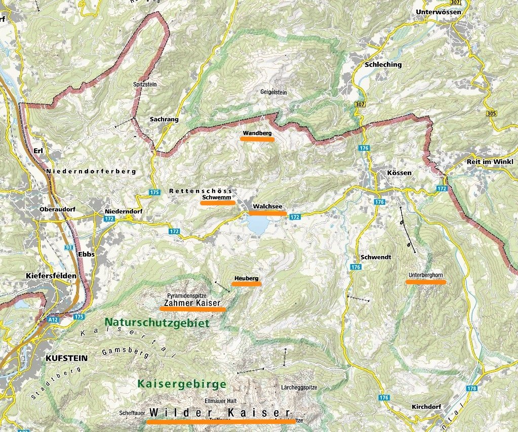 Rakousko - Kaiserwinkl: mapa trasy Walchsee - Lochnerský vodopád - Wandberg - Brennkopf - Schwemm (zdroj: Kompass mapy)
