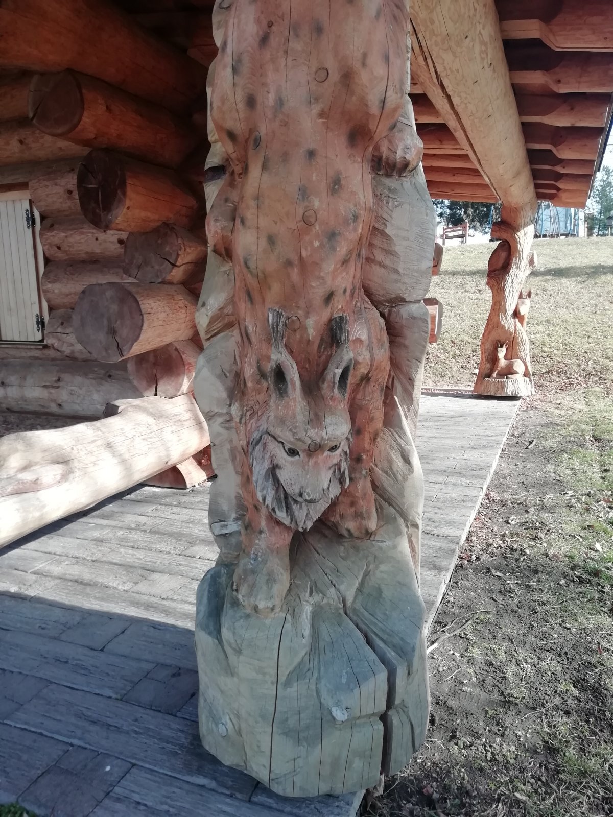 drevenú stavbu podopiera medveď, dvere vedúce na WC