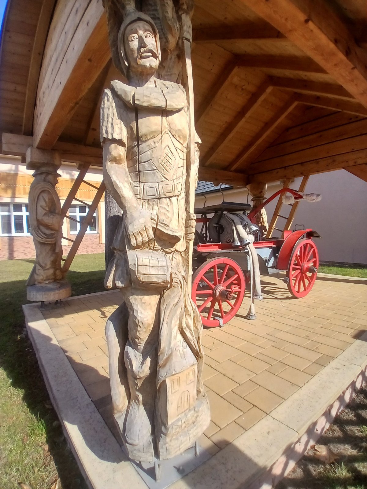 zo štítu prístrešku nad hasičskou striekačkou sa na okoloidúcich prizerá hasič