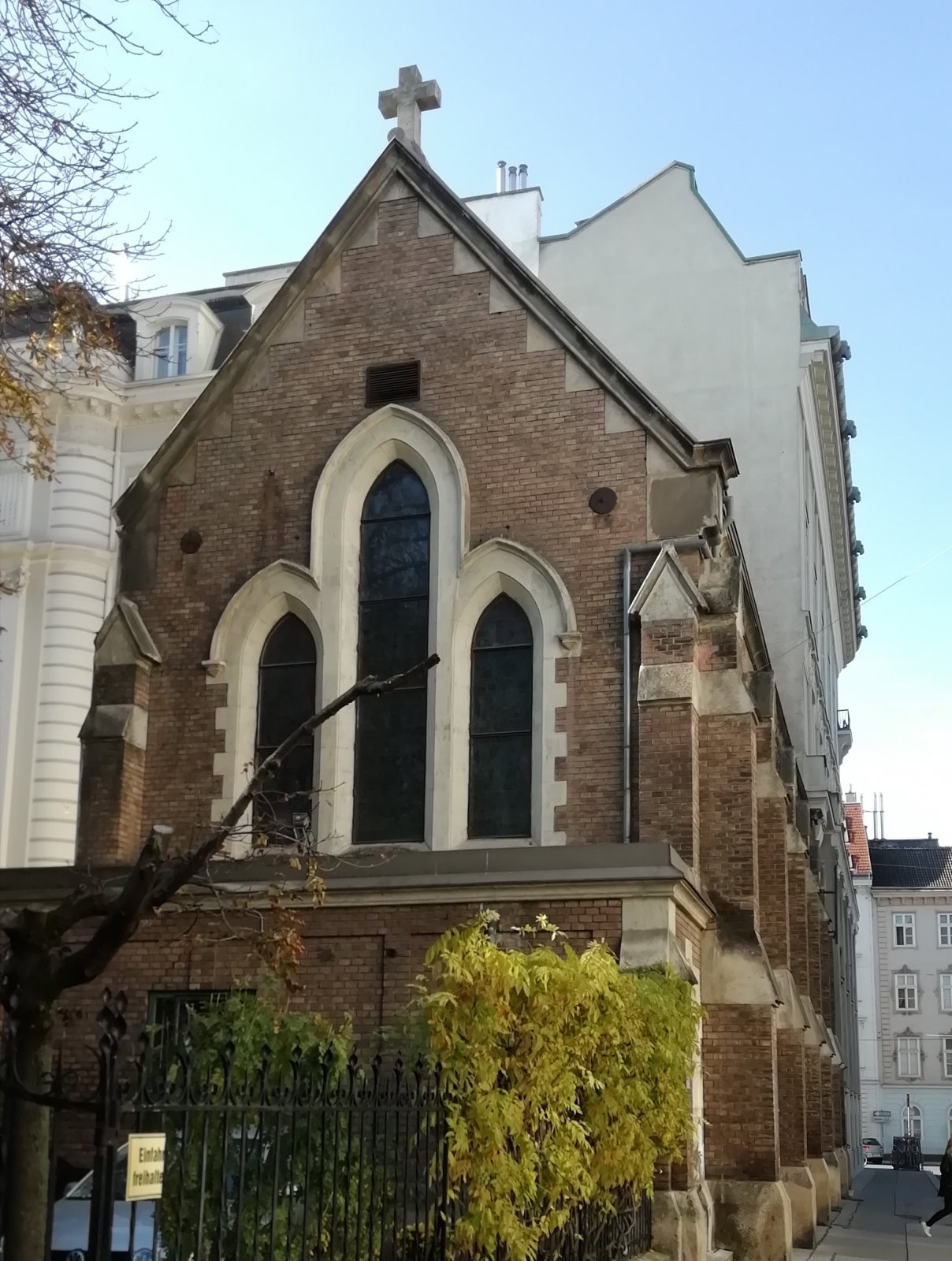 Od kostola sv. Mikuláša sme zamierili k záhradám zámku Belveder a odtiaľ sme sa chceli pomaly presúvať k hlavnej železničnej stanici vo Viedni, odkiaľ sme mali zakúpené spiatočné lístky do Bratislavi. Cestou k záhradám sme ešte "natrafili" na malý tehlový kostolík. Išlo o kostolík anglikánskej cirkvi. Nachádza sa pri Britskom veľvyslanectve. Spravili sme pár fotografii a doma som si čo to o kostolíku prečítala.