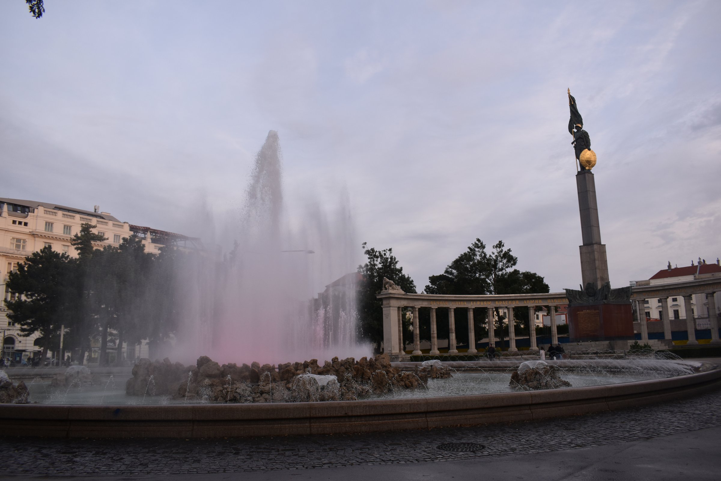 Prvý deň vo Viedni sme zakončili podvečernou prechádzkou po Ulici Princa Evgena Savojského, ktorá ide okolo parku obklopujúceho zámok Belvedér, ktorý si dal postaviť práve Evgen Savojský. Naším cieľom bolo neďaleké námestie Schwarzenbergplatz. Toto námestie je vlastne ulicou, ktorá sa rozširuje pred Schwanzerbergským palácom ( v súčastnosti je časť v rekonštrukcii ). Tu sa nachádza pamätník z roku 1945 venovaný sovietskym vojakom zabitým za 2. svetovej vojny počas viedenskej operácie, v ktorej padlo cca 17 000 vojakov ČA. Po intenzívnych bojoch bola Viedeň 14.4.1945 dobytá sovietskými silami.