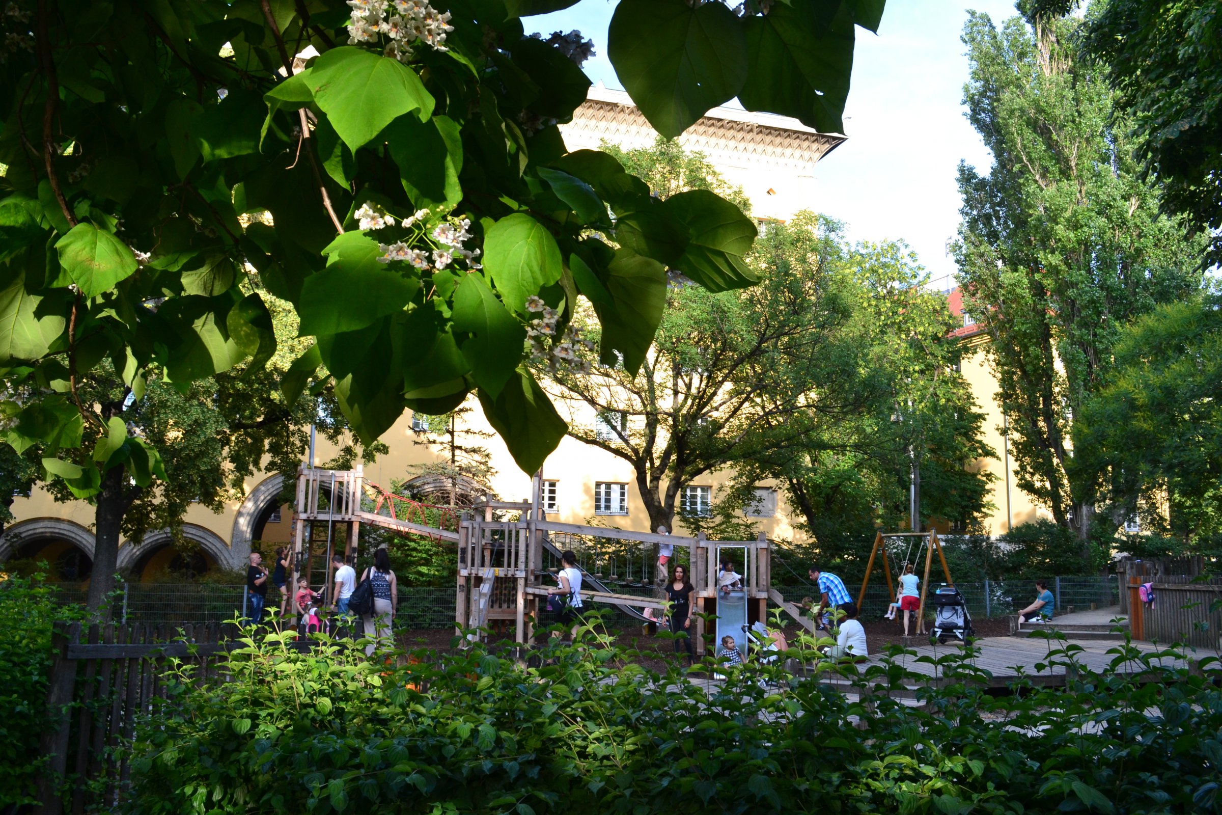 3 keramické okrasné fontány, ktoré roku 1927 vytvoril Robert Obsieger, zdobia nádvoria budov. Bohužiaľ jedna z nich už nemá sošku chlapčeka a ani jedna nestrieka, takže to kazí dojem ináč upravených budov. Budovy sú upravené, ale dvory nie - vysoké stromy, neupravené trávniky.