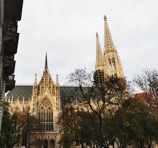 Ako som už spomínala, hlavným cieľom našej prechádzky po ubytovaní sa v penzione Baronesse bol biely kostol s dvoma vysokými vežami. Nevedela som o aký kostol sa jedná, len sa mi páčil. Zahliadla som ho už pri skoršej návšteve Viedne a keďže bol teraz neďaleko nášho ubytovania, mala som v pláne si ho konečne pozrieť. Išlo o votívny kostol na Ringstrasse - Wiewner Votivkirche.