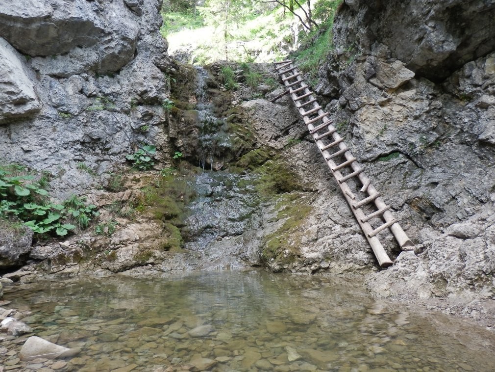 Pokud vás na fotografiích zaujal šikmo postavený žebřík, vězte, že se nejedná o vychýlení fotoaparátu, ale o reálný stav. Jeden turista u vodopádu nám sdělil, že o žebřík a průchodnost kaňonu se celá léta staral lidový řezbář Jozef Smutniak ze zmíněné Jóbovy Ráztoky. Po jeho smrti se další správce, soudě podle stavu žebříku, zatím nenašel. Pokud nikdo žebřík neopraví, časem nebude bezpečný. Jak můžete vidět na detailních záběrech, přibití vzpěry k levé stojině žebříku a konec pravé uhnívající stojiny žebříku zavěšené na lanku dlouhou životnost neslibují. Fotografie jsem pořídil v polovině července 2012.