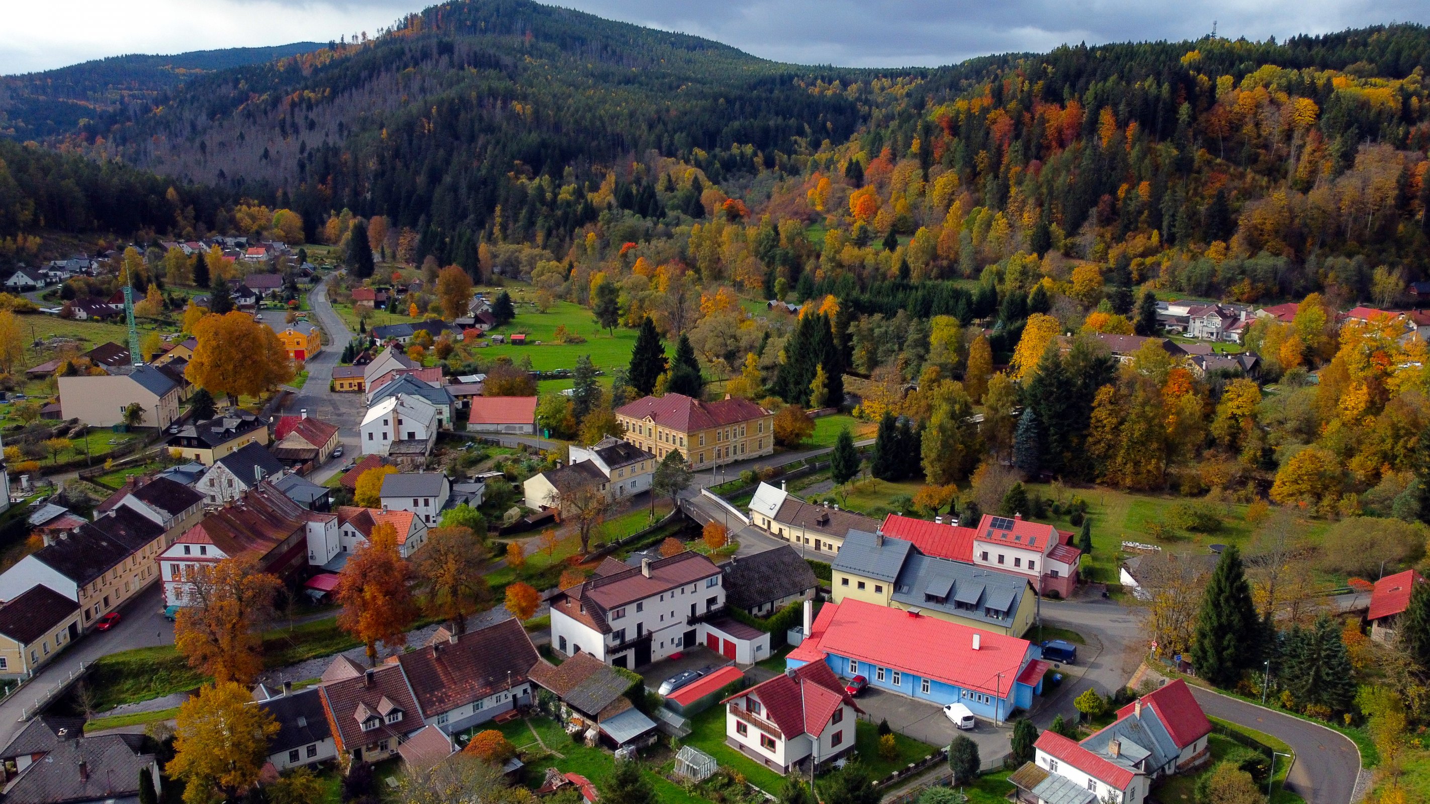 Nádherný podzimní pohled na šumavské městečko Rejštejn.