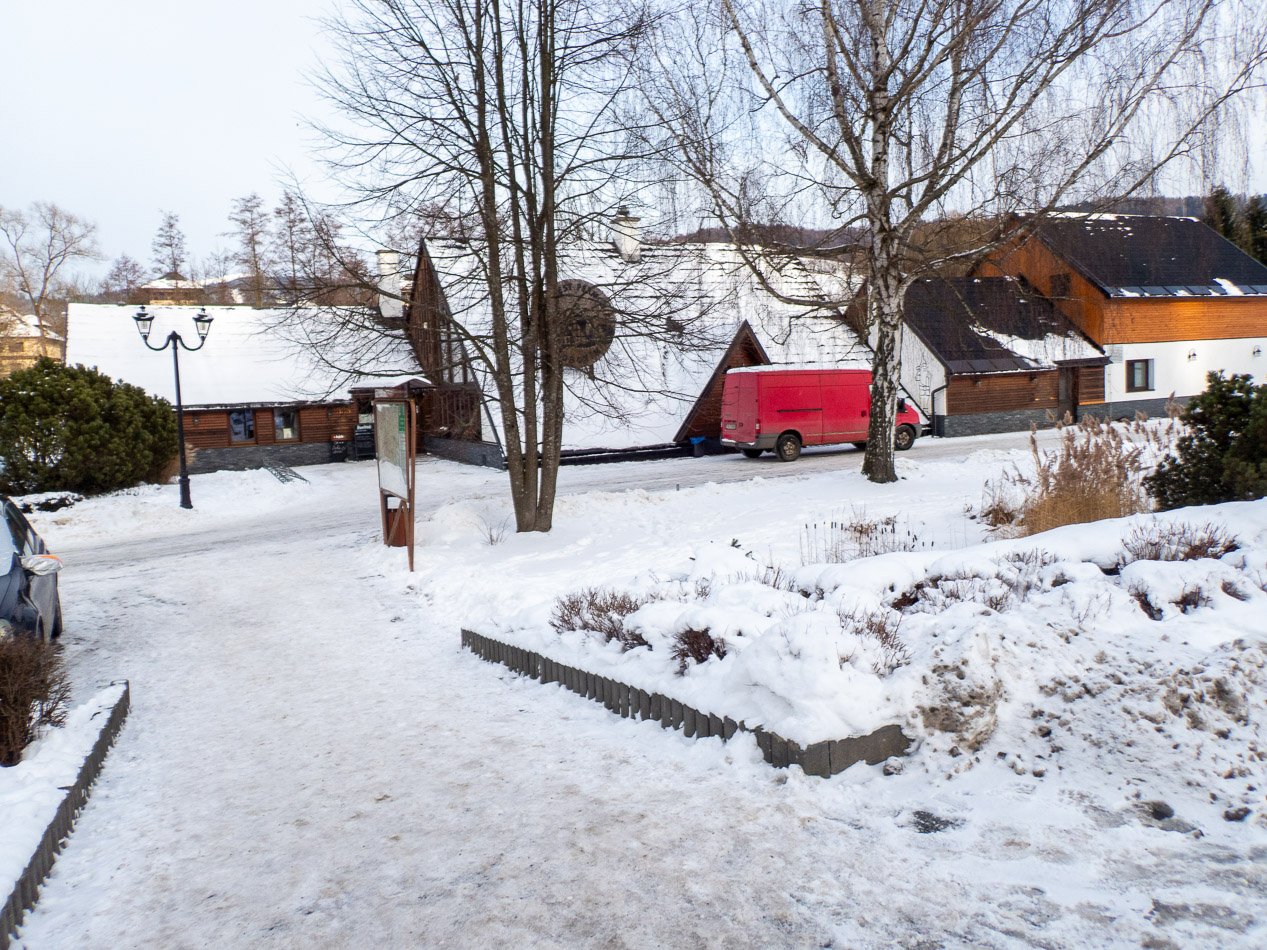 Za silnicí je motorest Permoník