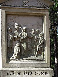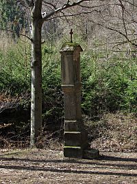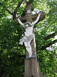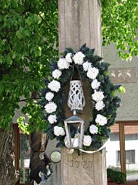 U hospůdky stojí starý kamenný kříž s plechovým malovaným korpusem Krista a vedle v trávě je umístěn Pomník obětem druhé světové války v podobě prostého balvanu, na čelní stěně s nápisem.