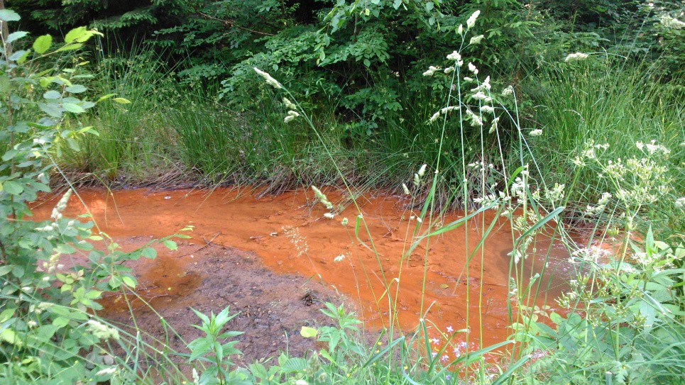 Na informační tabuli je zbarvení vody vysvětleno několika chemickými vzorci. Protože však již řadu let neusedám do školní lavice a chemie není mým oborem, uvedu pouze, že zajímavé rezavé zbarvení a odpudivý zápach po síře vzniká vzájemným působením vody s minerály a horninami obsaženými v ložiskové oblasti. Chemické reakce jsou podporovány zrychleným oběhem okysličených vod. Vznikající blátivé důlní okry se značným obsahem železa dávají vodě charakteristickou barvu a zápach. Podle legend a pověstí vytéká ze staré štoly krev a pot horníků.