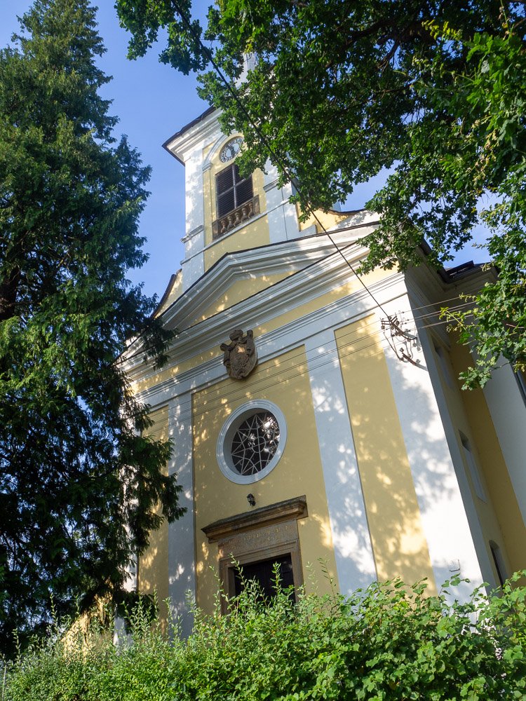 Nad vstupem do kostela s trojúhelníkovým štítem pokračuje hranolová věž s plechovou cibulí a špičatou stanovou střechou. Věž má obdélníková okna s balustrádami.