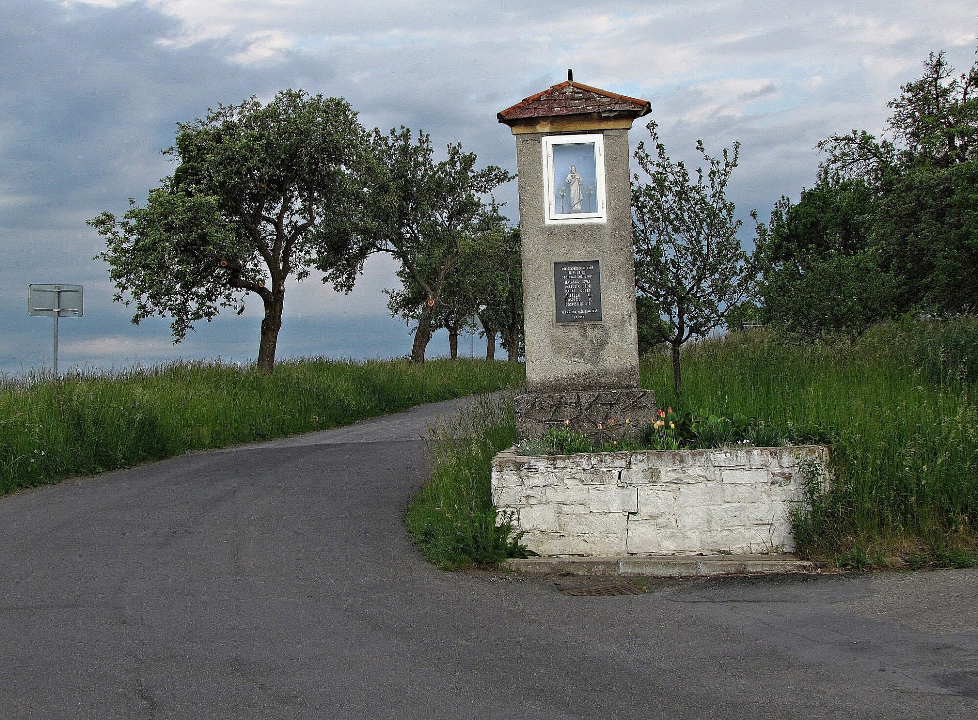 Stojí na západním konci obce napravo nad silnicí, která spojuje Roštění se sousedním Kostelcem u Holešova. Vysoký kamenný podstavec obzvláštňuje pamětní deska upomínající na místní padlé při osvobozování Roštění na konci druhé světové války.